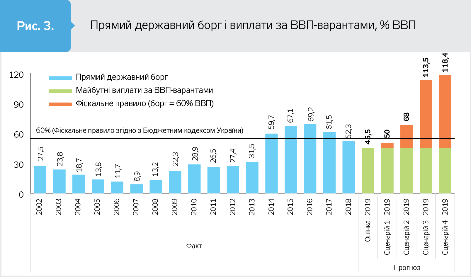 Тобто існуюче в Україні фіскальне правило щодо обмеження боргу рівнем 60% ВВП не має сенсу без урахування оцінок майбутніх виплат за ВВП-варантами.