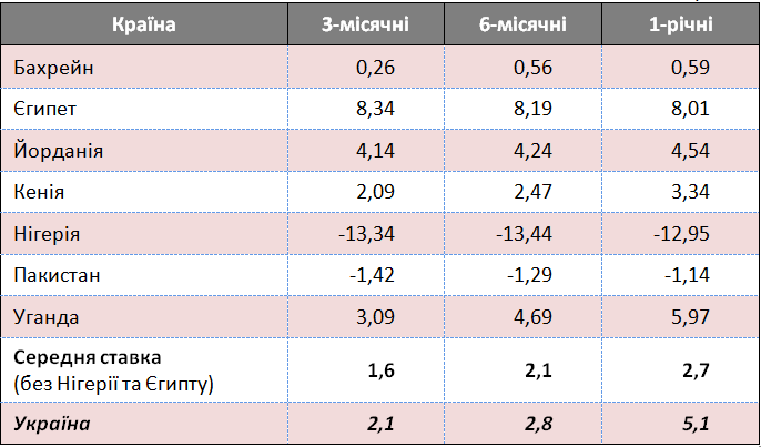 Надалі нами було розраховано показники реальної дохідності державних облігацій в Україні та у зазначених країнах і встановлено, що середня реальна ставка за облігаціями строковістю 3, 6 і 12 місяців у країнах вибірки становила 1,6, 2,1 і 2,7% річних. Такі показники, знову ж таки, різко контрастують із рівнем реальних ставок за ОВДП в Україні, які досягають 2,1, 2,8 і 5,1% річних (див. табл. 2).