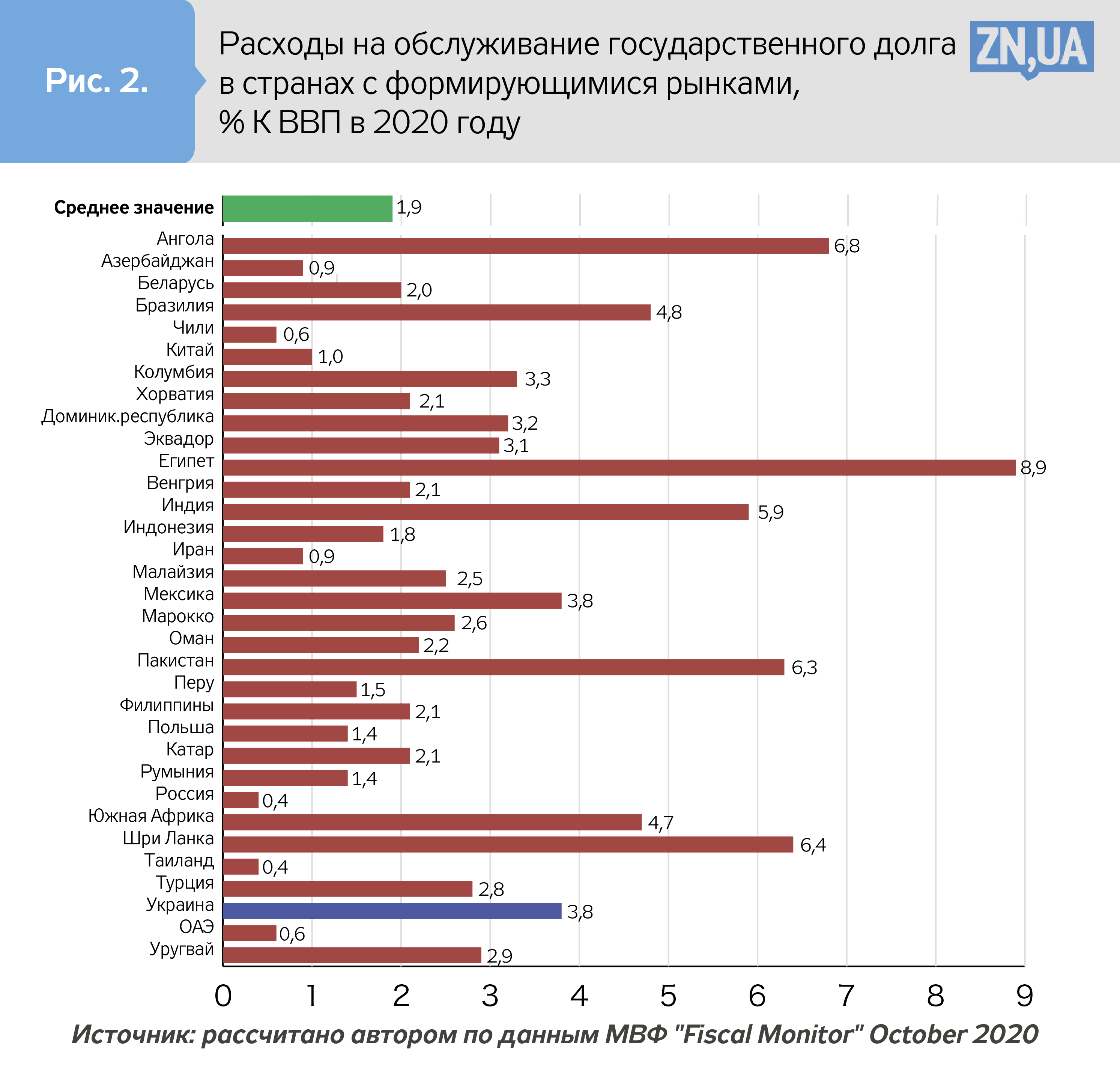 Про вичерпання потенціалу підвищення відсоткових ставок за борговими зобов'язаннями уряду свідчить і такий показник, як відношення відсоткових виплат за боргом до ВВП. В Україні зазначений показник 2019 року становив 3% ВВП, а 2020-го він зросте до 3,8% ВВП. У той же час середній рівень витрат на обслуговування боргу в країнах з ринками, що формуються, 2020 року становитиме 1,9% ВВП (див. рис. 2). Тобто в Україні при середньому рівні боргового навантаження відносна величина відсоткових виплат уже вдвічі перевищує середній показник виплат у країнах з ринками, що формуються.