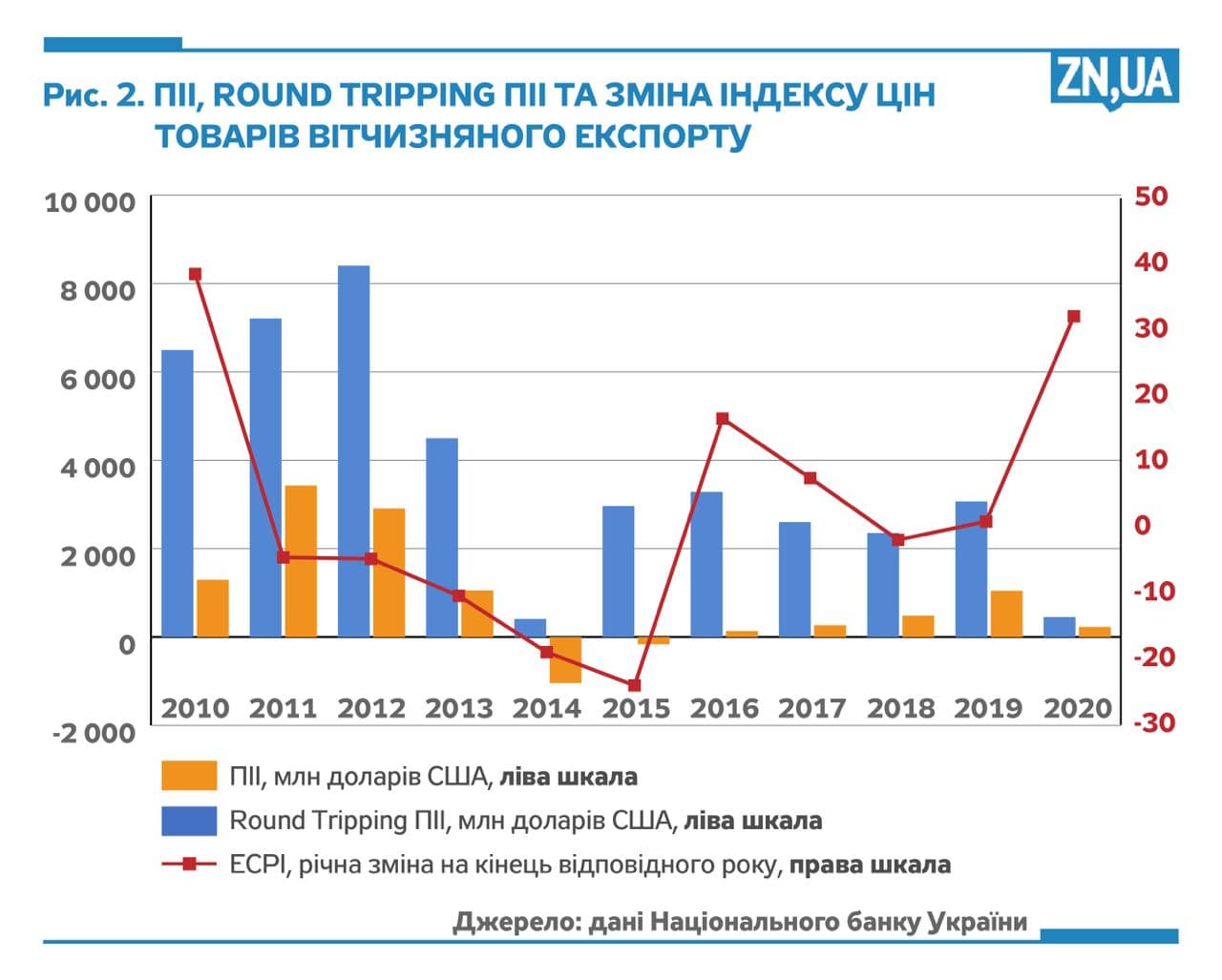 Беручи до уваги сировинну природу вітчизняного олігархізму, можна припустити, що між світовими цінами на товари українського експорту та round tripping операціями має бути певний зв’язок. Він зумовлений тим, що ціни експорту є базою виведення коштів через трансфертний канал. А round tripping операції — каналом заведення коштів, але вже у нерезидентському статусі. Рисунок 2 підтверджує цю гіпотезу (ситуація щодо round tripping ПІІ у небанківський сектор і щодо round tripping боргових інструментів майже ідентична, тому відповідні дані не наводяться).