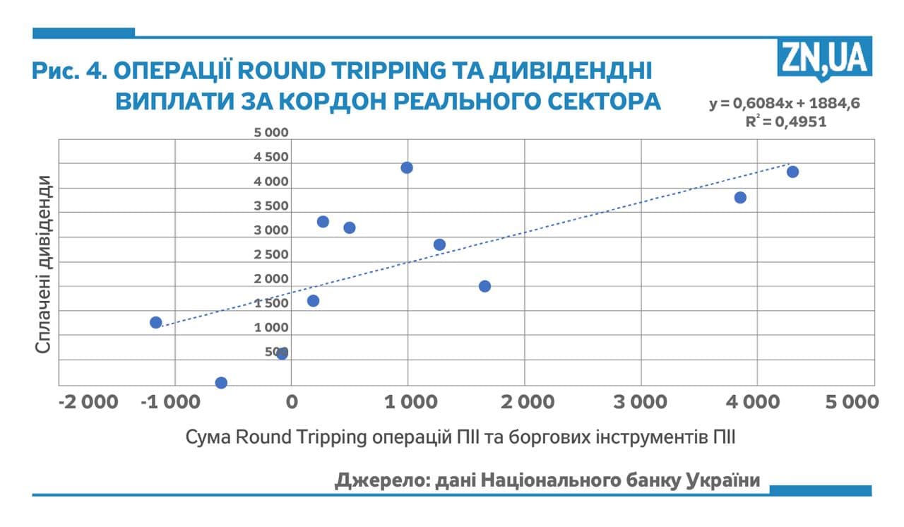 Поєднання даних по заведенню і виведенню капіталів допомагає побачити появу цілої окремої галактики транскордонних потоків, якій так мало приділяється уваги, наприклад, порівняно з тими самими нерезидентськими вкладеннями в ОВДП. Рисунок 4 демонструє наявність сильної прямої залежності між обсягами заведення капіталів через канали round tripping операцій і виведення через дивіденди.