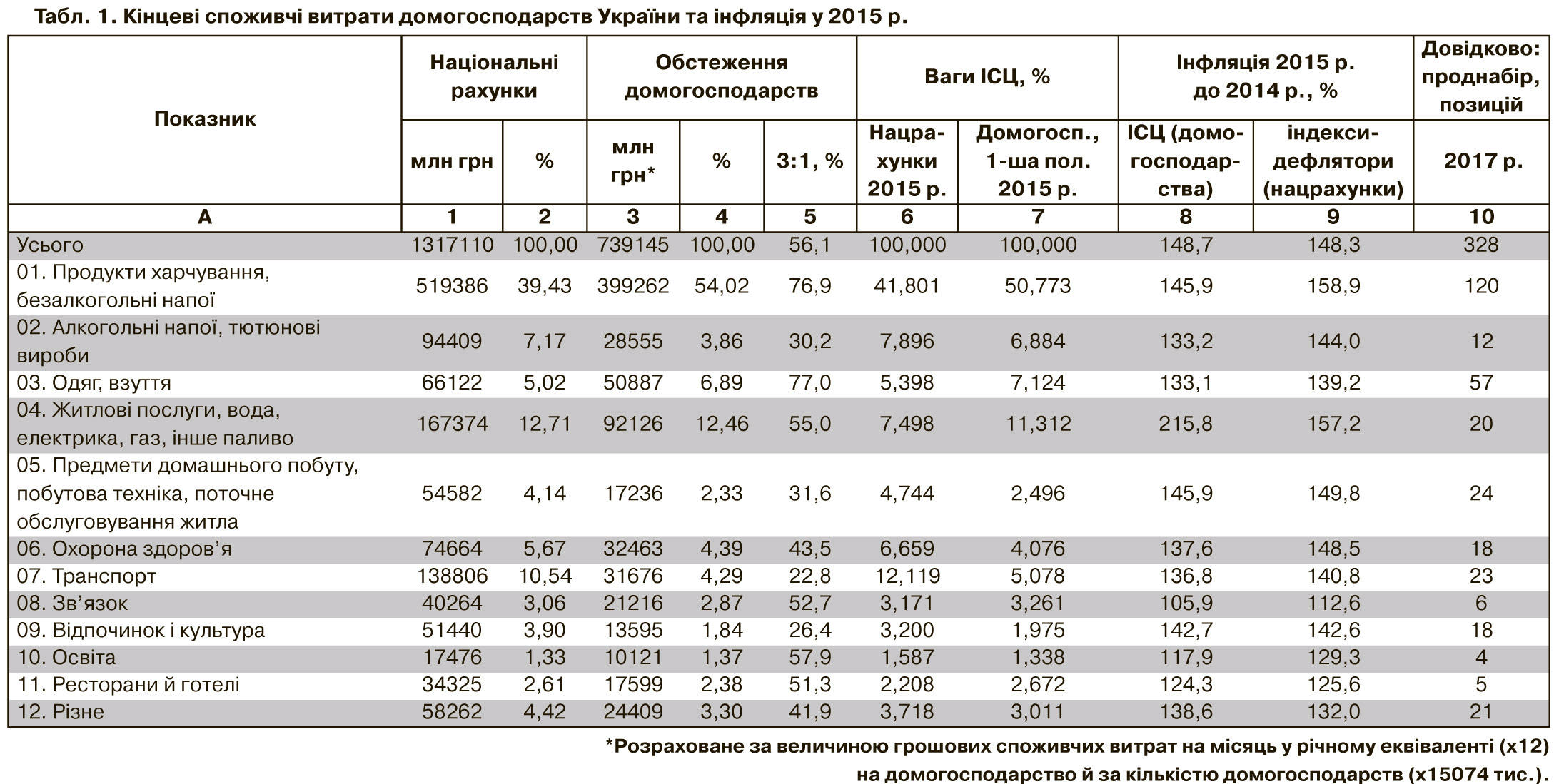 Розбіжності у величинах, структурі споживчих витрат домогосподарств і ваг за нацрахунками та обстеженнями домогосподарств із одержуваними за ними індексами (див. табл. 1) надто масштабні, щоб їх ігнорувати. Виходить, що у 2015 р. споживчі витрати домогосподарств у нацрахунках загалом у 1,86 разу перевищували дані обстежень витрат домогосподарств, у 3,3 разу - за алкоголем і тютюновими виробами, у 3,8 разу - за відпочинком і культурою та аж у 4,4 разу - за транспортом.