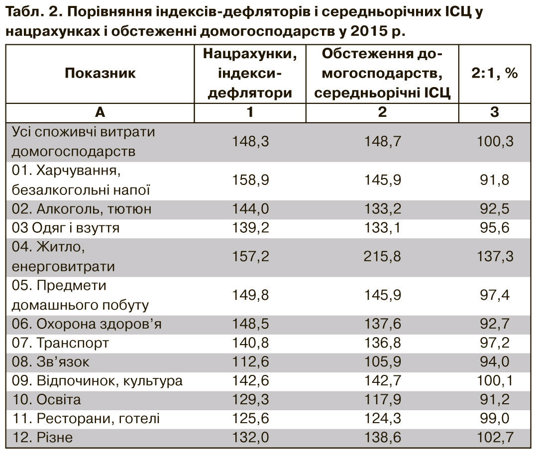 Зрозуміло, що такі масштабні розбіжності даних нацрахунків та обстежень домогосподарств не можуть не впливати на ІСЦ, який визначається за оновленою методологією. І це дуже серйозна проблема. У принципі, і при колишній методиці загальні (а особливо групові) індекси-дефлятори нацрахунків не повинні були збігатися. І не збігалися, як це видно з порівняльних даних табл. 2, із загальними й груповими річними аналогічними ІСЦ, що визначалися на базі обстеження витрат домогосподарств.