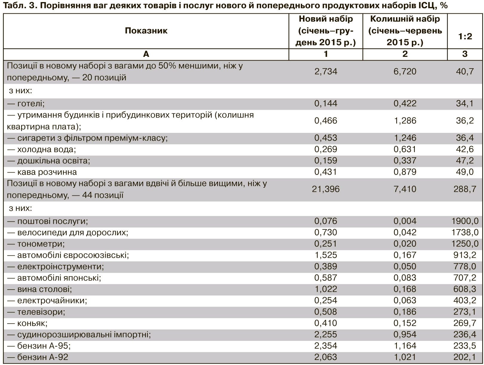 Цілком обґрунтовано з нового продуктового набору виключили кілька позицій з дуже невеликою питомою вагою (на 6 липня 2015 р.), а також ті, що замінюються сучаснішими товарами. Це ікра червона (0,013%), напої слабоалкогольні (0,005), бензин А-76 і А-80 (0,007), телефонні апарати (0,004%), які інтенсивно замінюються мобілками, малопопулярна й дорога мийка автомобілів (0,004), МР3-плеєри (0,024), фотопослуги (0,030), принтери (0,014% ). Із вагоміших позицій - курси з підготовки до вступу у ВНЗ (0,106%), які відпали через зміну порядку прийому до них, костюми для хлопчиків (0,039%), що, очевидно, зумовлене необов'язковістю носіння шкільної форми. Трохи спантеличує виключення барів (0,084%), якщо раніше їхню вагу не було завищено.