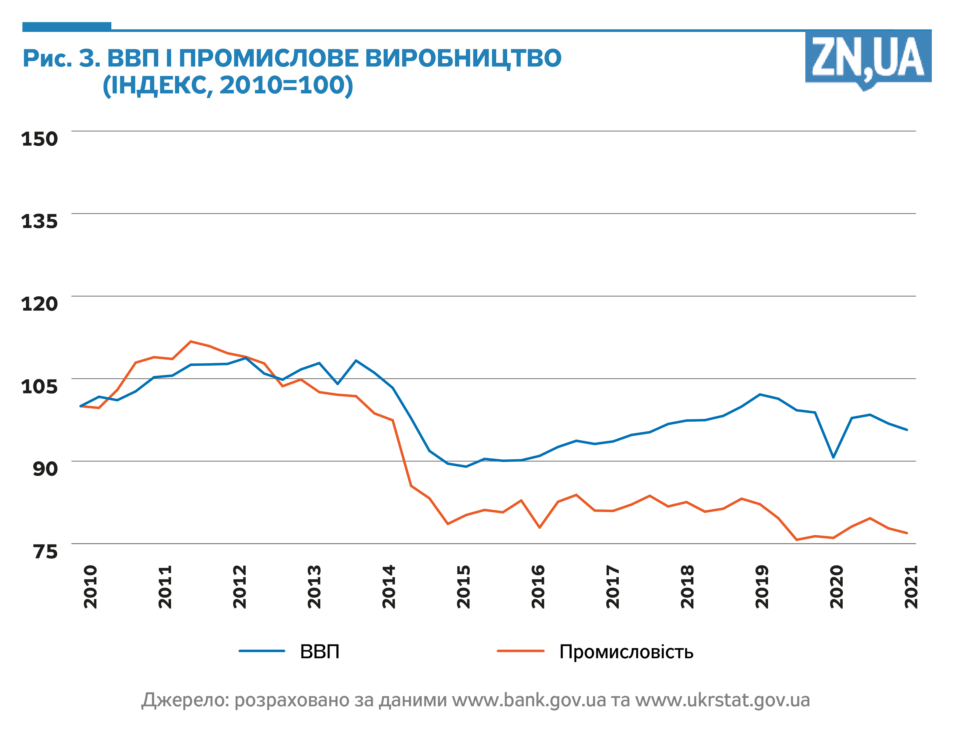 Пояснень прискорення інфляції може бути багато, але причина завжди лише одна: надлишок грошової маси, який «переслідує» недостатню кількість товарів. Грошей в Україні стало значно більше (див. рис. 1), що прискорило інфляцію (див. рис. 2), але не допомогло ні зростанню ВВП, ні відновленню промислового виробництва (див. рис. 3). Надлишок грошової маси (або грошовий «навіс») зразка 2020–2021 років став черговою ілюстрацією монетарних аксіом, які з тих чи інших причин в Україні справджуються набагато краще, ніж у країнах з розвиненою ринковою економікою. Це і дезорієнтує багатьох вітчизняних фахівців, які намагаються знайти рішення українських проблем у досвіді США чи країн єврозони. Але ж немає нічого більш помилкового. Ми не країна з резервною валютою, а НБУ — не Федеральна резервна система в її сьогоднішньому стані.