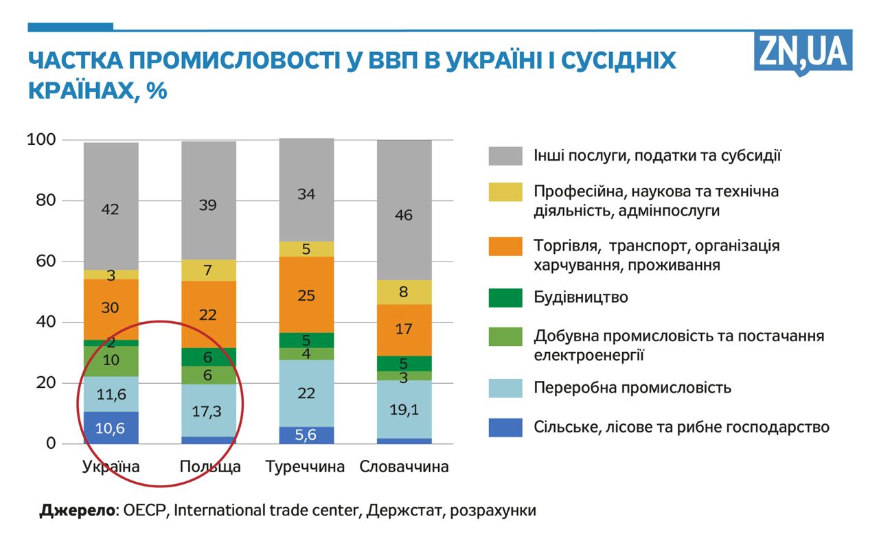 Картина цієї відмінності не може не поставити ще одного запитання: чому так сталося та як це змінити? Тому наступна картина має показати відмінність у структурі економік наших країн, а саме: значно нижчу частку переробної промисловості в Україні.