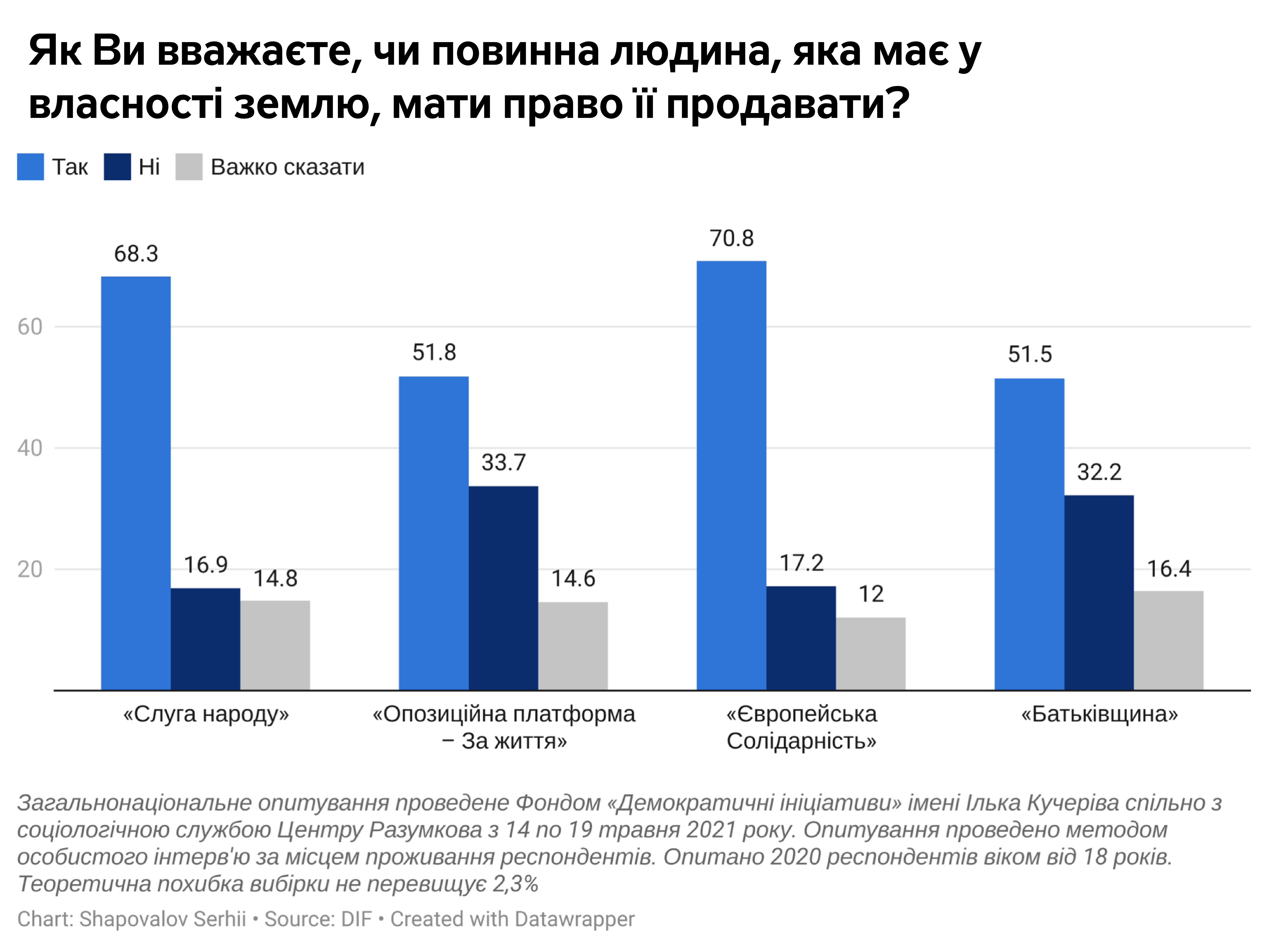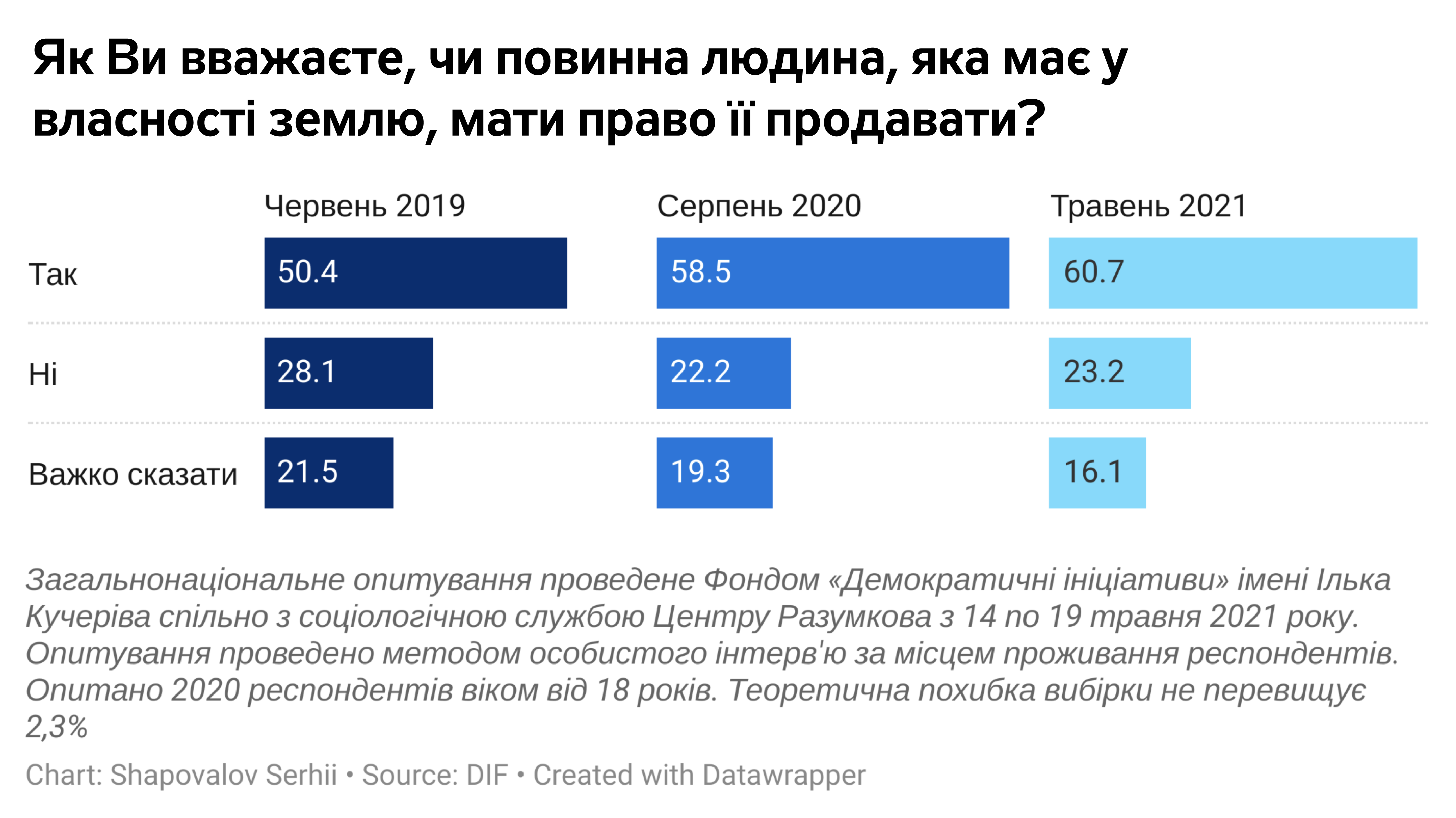 Опитування проведено Фондом «Демократичні ініціативи імені Ілька Кучеріва» спільно з соціологічною службою Центру Разумкова з 14 по 19 травня 2021 року в усіх регіонах України за винятком Криму та окупованих територій Донецької та Луганської областей. Опитано 2020 респондентів віком від 18 років. Теоретична похибка вибірки не перевищує 2,3%. Фінансування опитування здійснювалося в межах проєкту МАТРА Посольства Королівства Нідерландів.