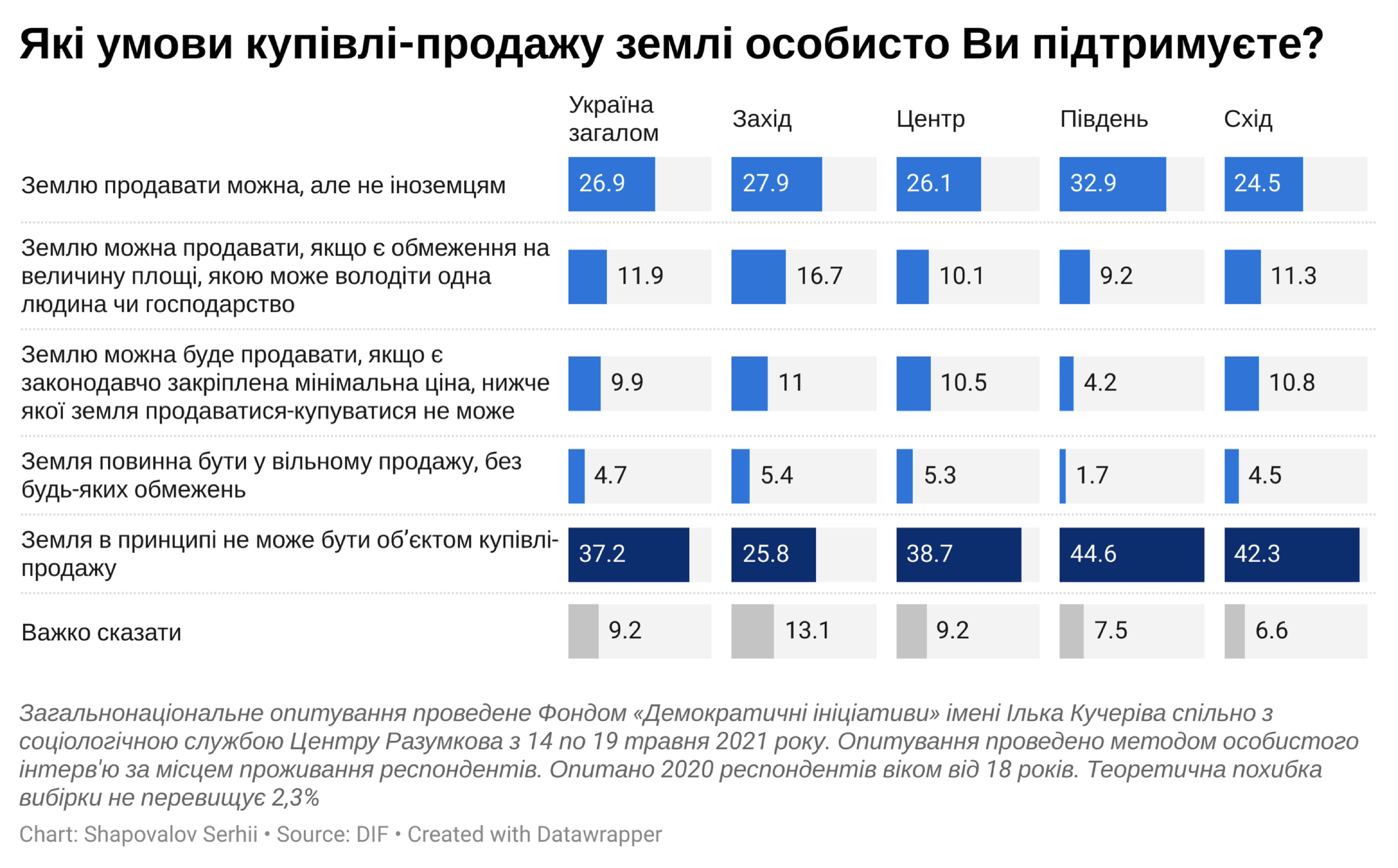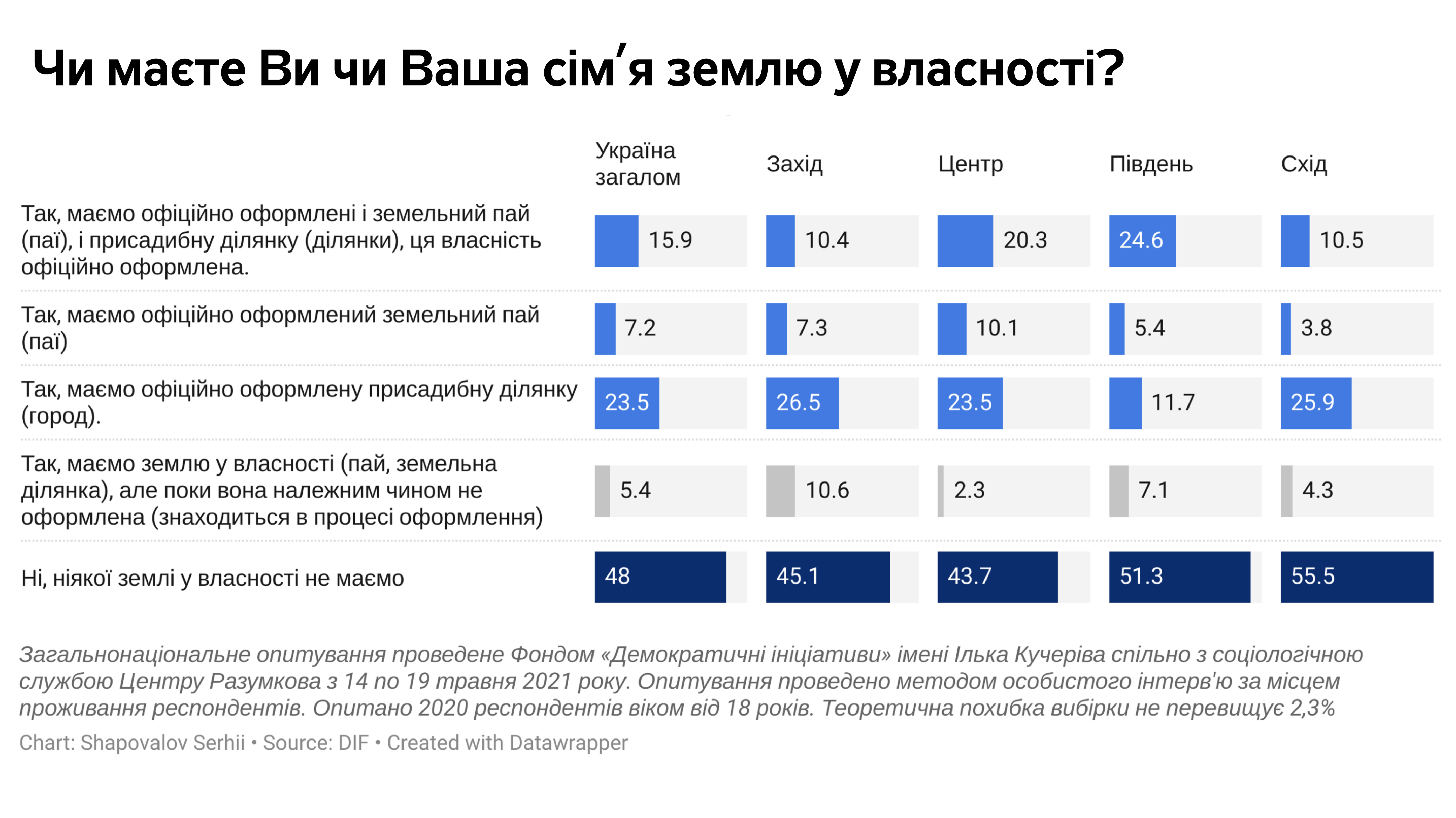 Протягом грудня 2020-го — лютого 2021 року дослідження «Демініціатив» охопило 14 областей України: на сході — Дніпропетровську, Запорізьку, Донецьку, Луганську; на заході — Чернівецьку, Львівську, Рівненську, на півдні — Одеську, Миколаївську, Херсонську; в центрі — Житомирську, Чернігівську, Полтавську та Київську. У кожному регіоні збирали у фокус-групи звичайних селян — власників паїв і дізнавалися, чим вони живуть, що їх непокоїть у зв’язку з оголошеною та затвердженою земельною реформою, з якими почуттями вони дивляться у найближче майбутнє.