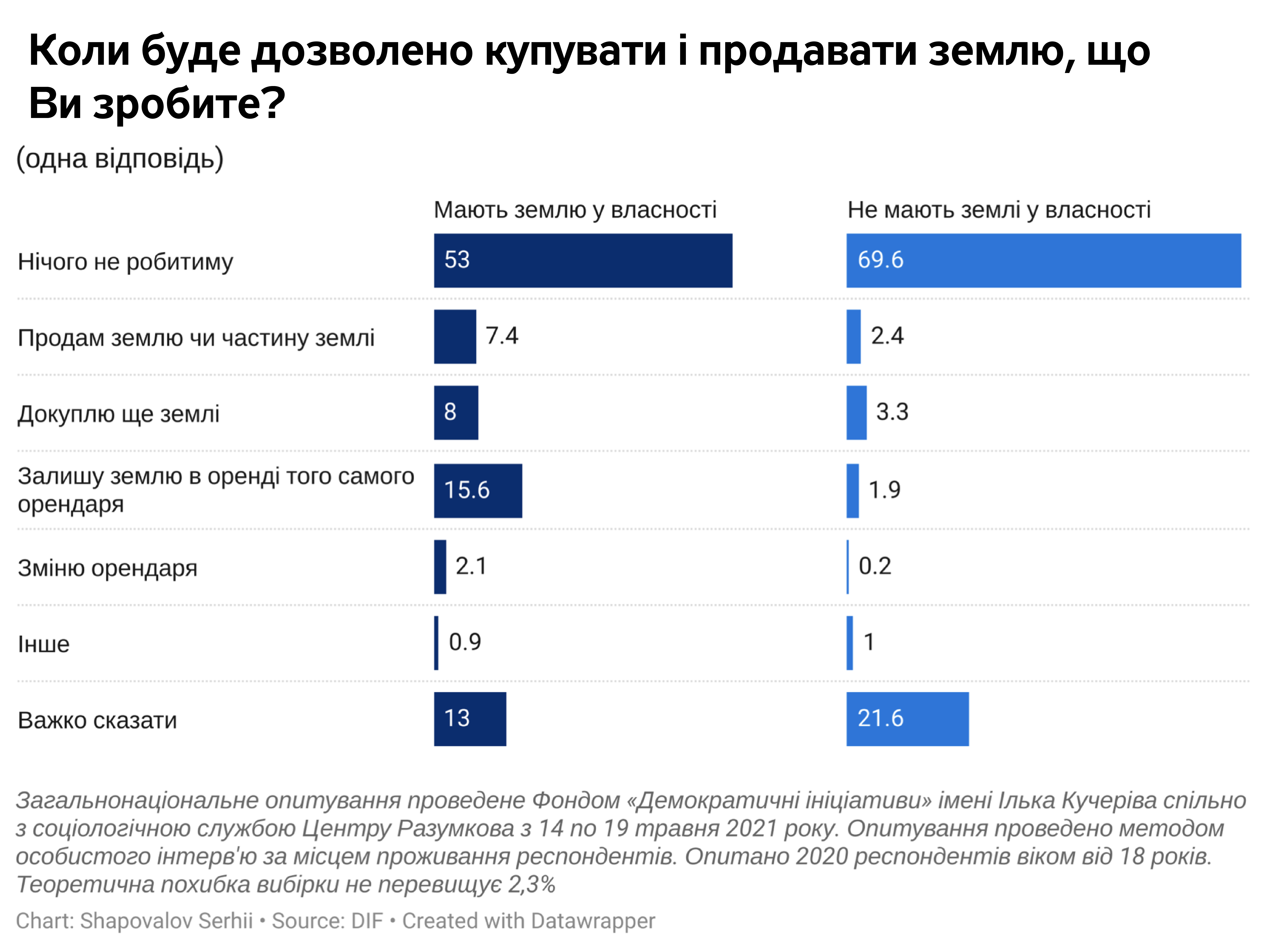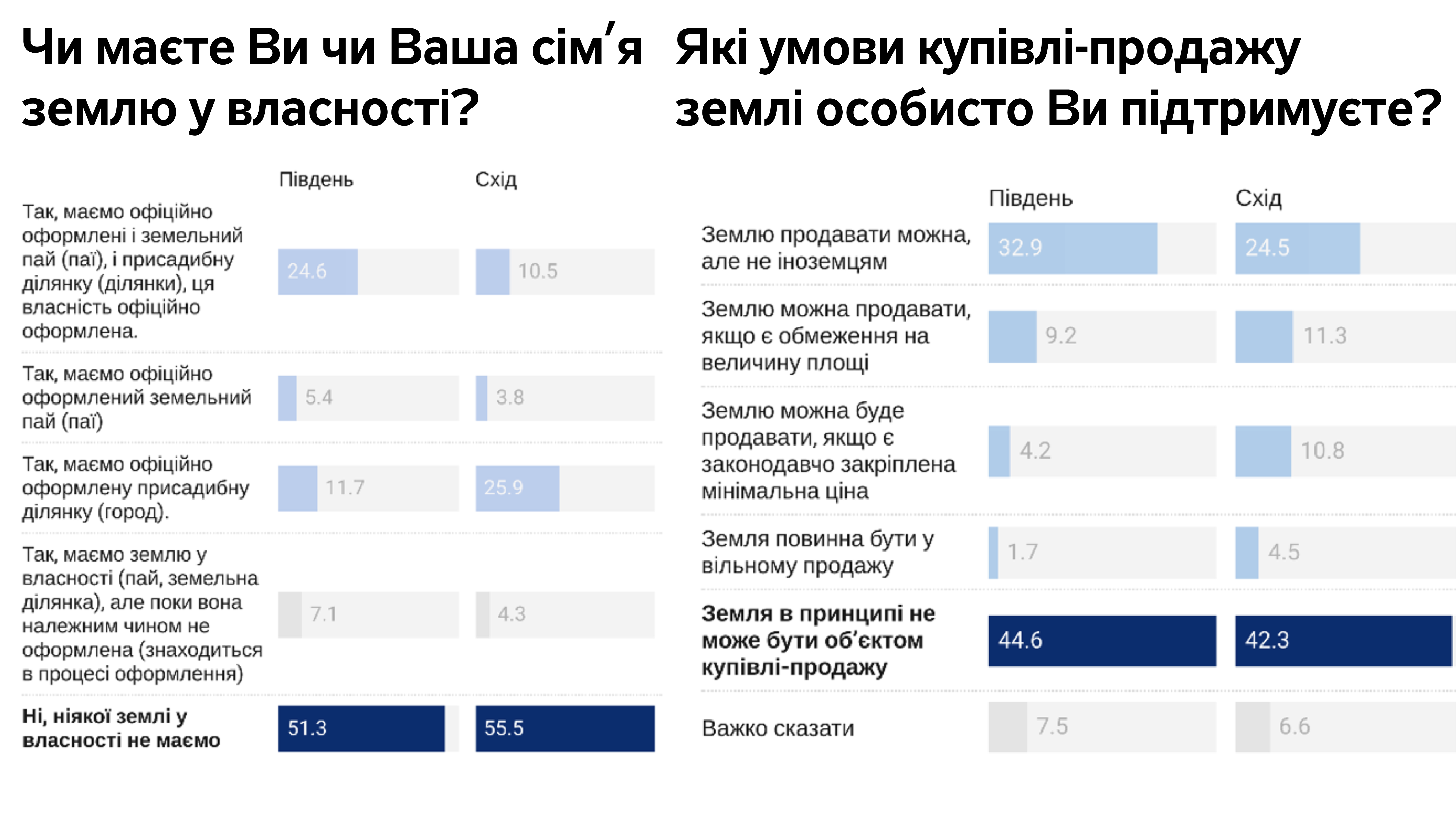 З одного боку, багато власників паїв вважають, що нинішня земельна реформа стане повторенням невдалої та несправедливої масової приватизації 1990-х. Про те, що землі скуплять олігархи чи ділки, щоб потім продати іноземцям, говорили у Луганській, Львівській, Чернігівській, Донецькій, Херсонській та Одеській областях.