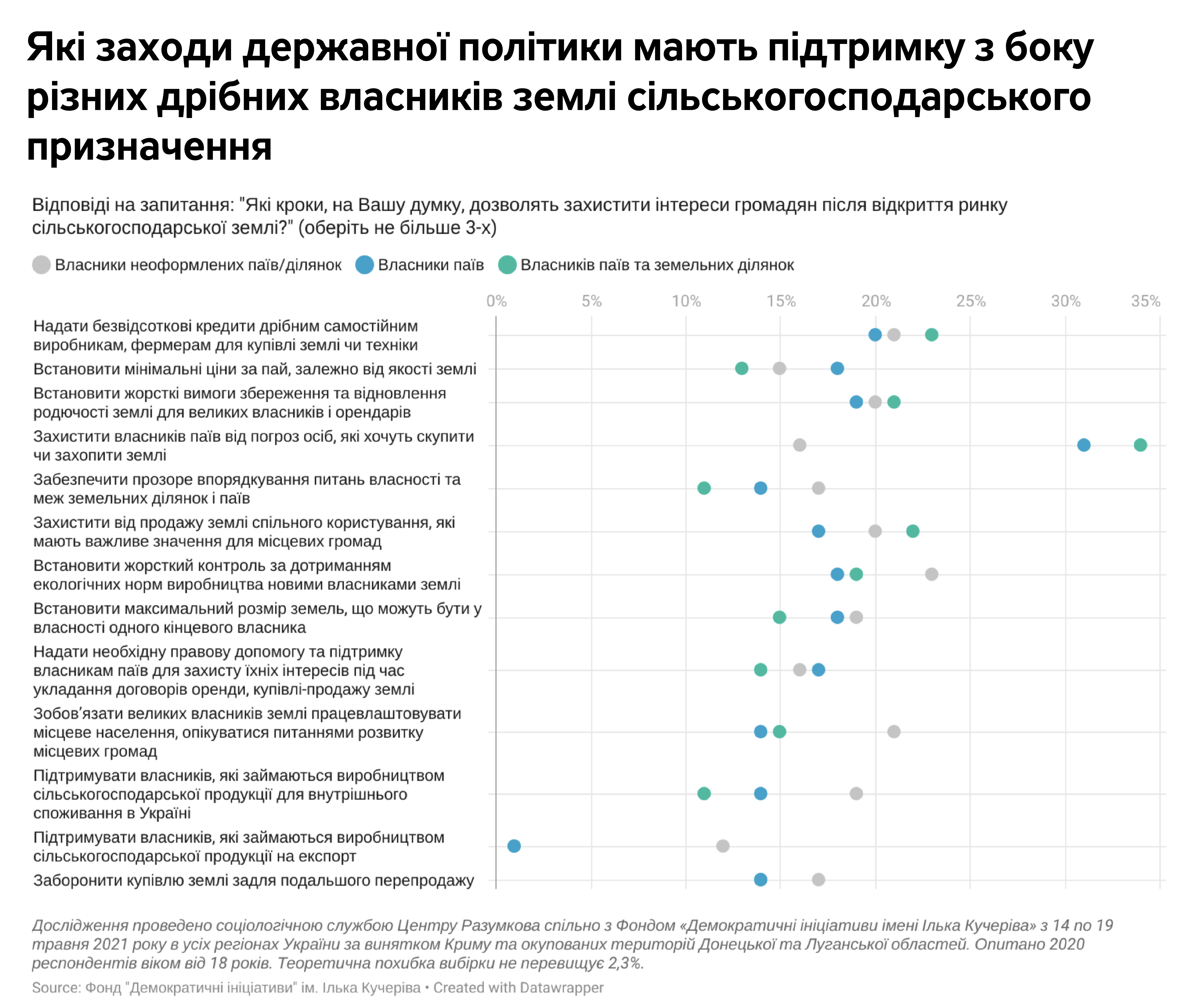 У травні 2021 року Фонд «Демократичні ініціативи» протестував у загальнонаціональному опитуванні суспільну підтримку пропозицій щодо державної політики, які були сформульовані під час фокус-груп. Отже, за даними опитування, найбільшу підтримку серед дрібних землевласників мають такі пропозиції до уряду:
