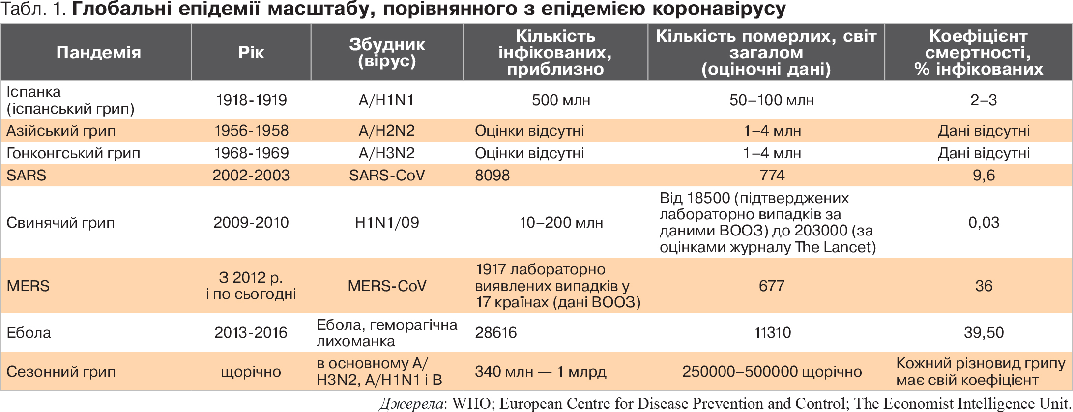 Для початку трохи історії. Епідемії завжди переслідували людство (див. табл. 1). Наведені дані свідчать про те, що, попри всі наші приголомшливі успіхи в різних сферах, епідемії є реальною світовою проблемою, оскільки в світі, який стрімко глобалізується, економічні, медичні та інші проблеми окремих країн і регіонів можуть швидко стати проблемами світової спільноти.