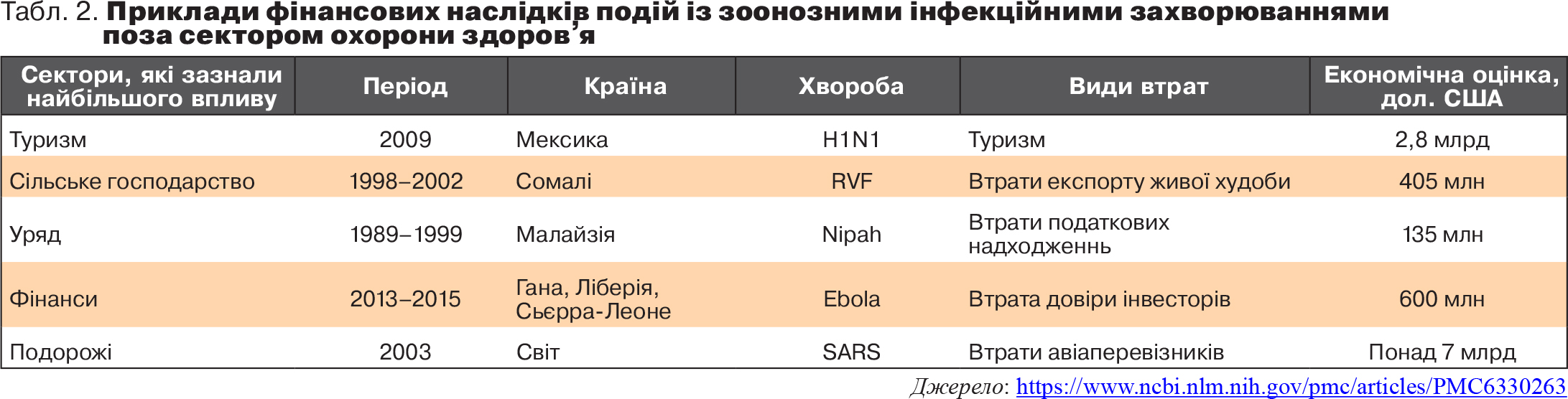 До речі, для повноти картини слід згадати і про епідемії, які вражають тварин і рослини. Як свідчить досвід попередніх епідемій, найбільших економічних втрат зазнають саме ті країни, де спалахують епідемії, але при цьому збитки мають досить чітку секторальну прив'язку (див. табл. 2). Тому сукупний економічний ефект цих двох видів епідемій є досить відчутним у глобальному вимірі.
