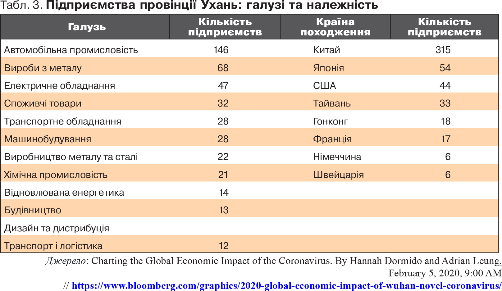 Епідемія коронавірусу спалахнула в провінції Ухань, структуру економіки якої наведено у таблиці 3.