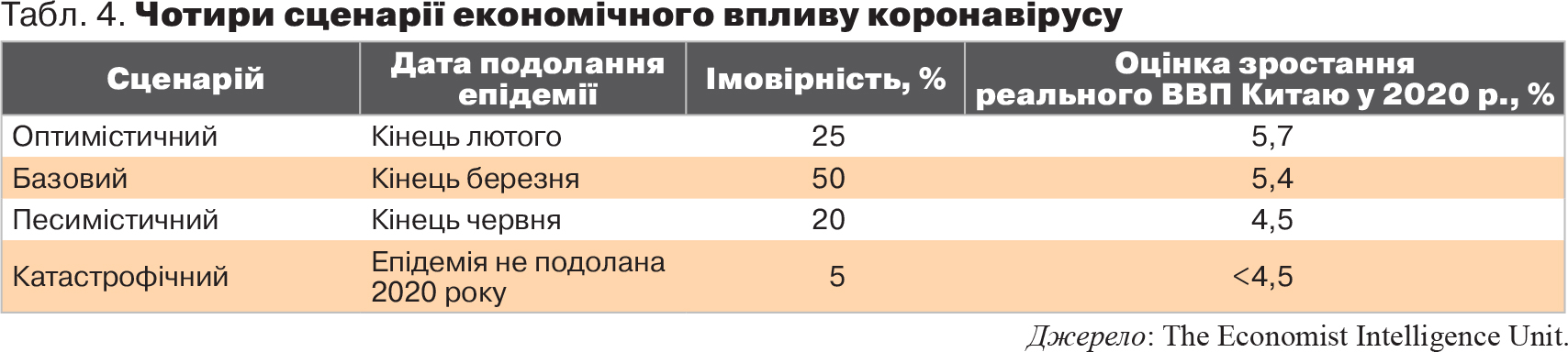 Ці дані показують, які саме сектори зазнали першого удару вірусу і запустили ланцюг негативних економічних ефектів через внутрішні та зовнішні виробничо-комерційні ланцюги, до складу яких вони входили. Далі можна аналізувати окремі сектори, галузі, сегменти ринку тощо з тим, щоб детально описати всі види втрат. Таке дослідження є дуже важливим для детального розуміння механіки поширення відповідних економічних шоків, але в цій статті обмежимося лише оцінкою впливу епідемії коронавірусу на економіку Китаю в цілому (див. табл. 4). Ну а висновки з цих даних кожен може зробити самостійно.