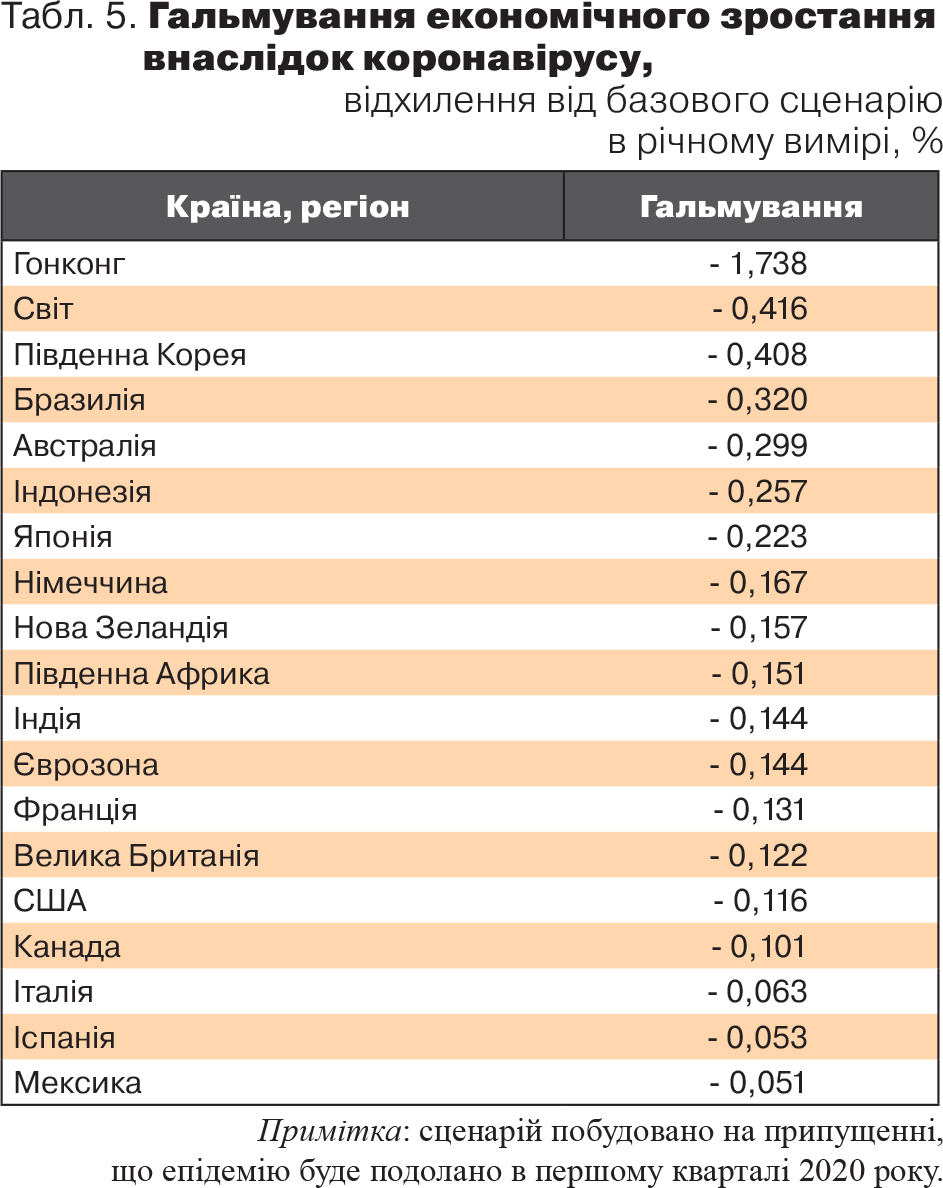 Сьогодні практично всі експерти погоджуються з тим, що епідемія негативно вплине на світову економіку. Але при цьому переважно всі розрахунки будуються на припущенні про те, що епідемію подолають у першому кварталі 2020 року, а тому вплив буде відчутним, але короткостроковим. Одну з оцінок такого плану наведено в таблиці 5.