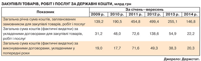 А тим часом система державних закупівель згортається: схеми не міняються, охочих нажитися на процесі не стає менше, а от держкошти тануть на очах. На жаль, статистика про держзакупівлі публікується раз на квартал, і останніх даних ще немає. Але якщо подивитися на показники трьох кварталів 2014-го, стає зрозуміло, що загальний стан сектора держторгів стрімко погіршується.