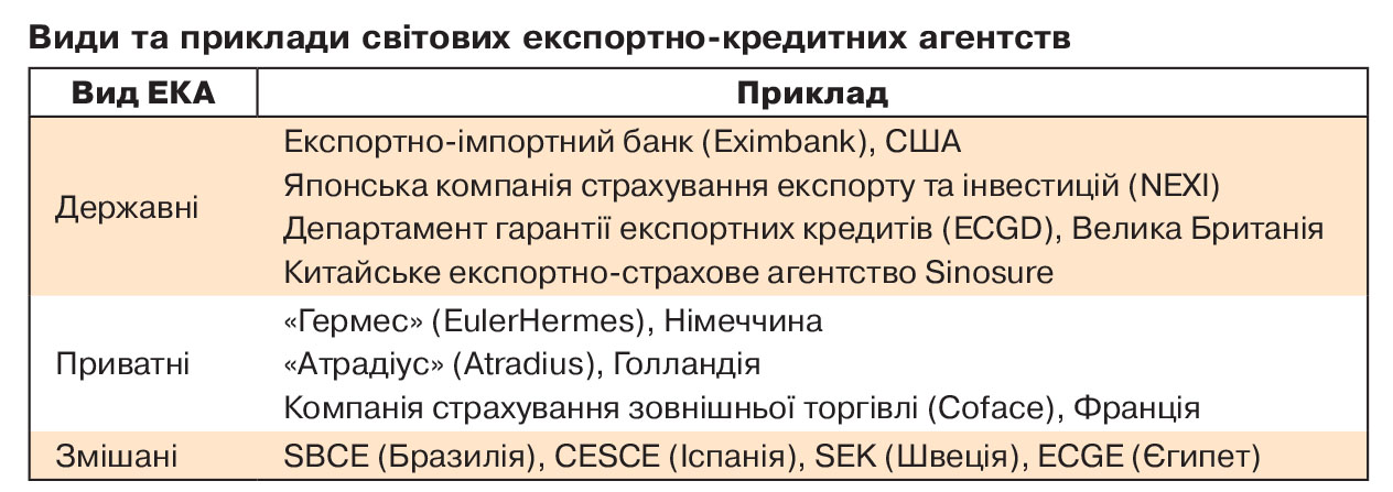 Установи з підтримки експорту різної форми власності діють майже в усіх розвинених країнах і країнах, що активно розвиваються. На сьогодні ЕКА успішно функціонують у понад ста країнах світу. Найвідоміші серед існуючих ЕКА: Eximbank (США), NEXI (Японія), Euler Hermes (Німеччина), COFACE (Франція), Atradius (Нідерланди), SBCE (Бразилія), CESCE (Іспанія), SEK (Швеція), Sinosure (Китай). Відповідні установи створено й у країнах Східної Європи, приміром у Чехії, Польщі, Угорщині, Болгарії, Литві, Естонії.