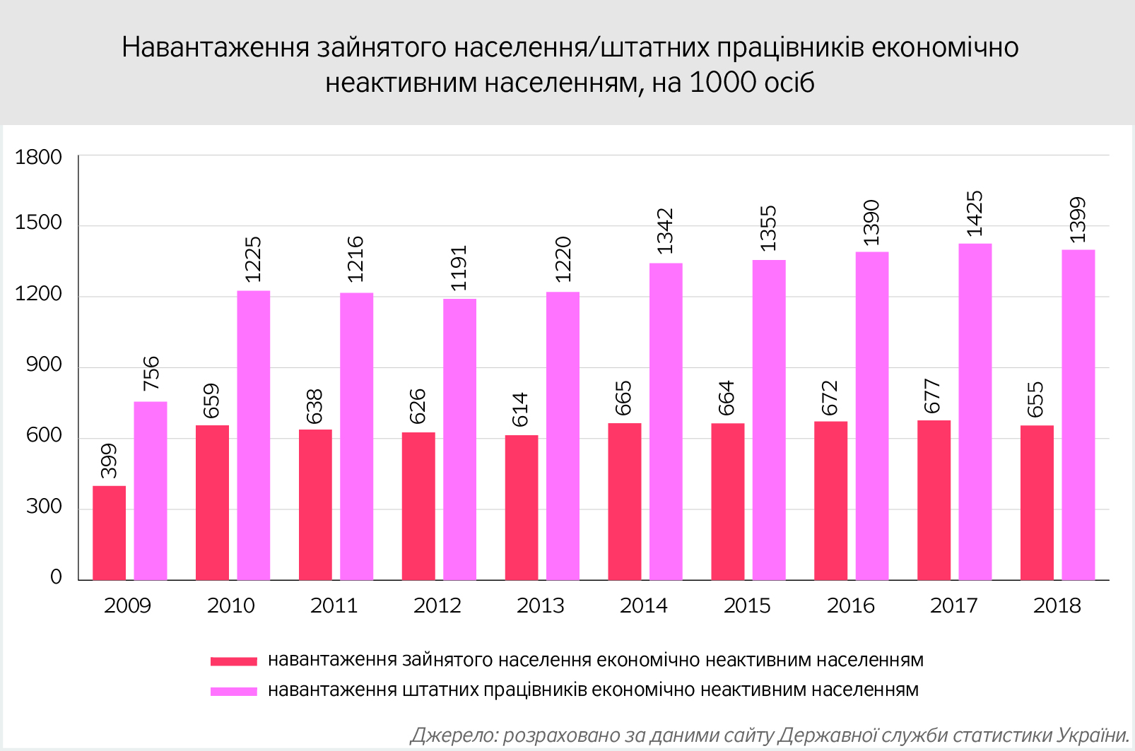 На тлі несприятливих демографічних тенденцій, дефіциту кваліфікованого трудового потенціалу відбувається збільшення соціального утримання, що посилює навантаження на працююче населення та соціальні фонди. Середньооблікова кількість штатних працівників у 2017 р. становила 7,68млн осіб при чисельності наявного населення України на 1 січня 2018-го 42,39 млн (за даними Державної служби статистики). Тобто один працюючий утримує більш як п'ять осіб.
