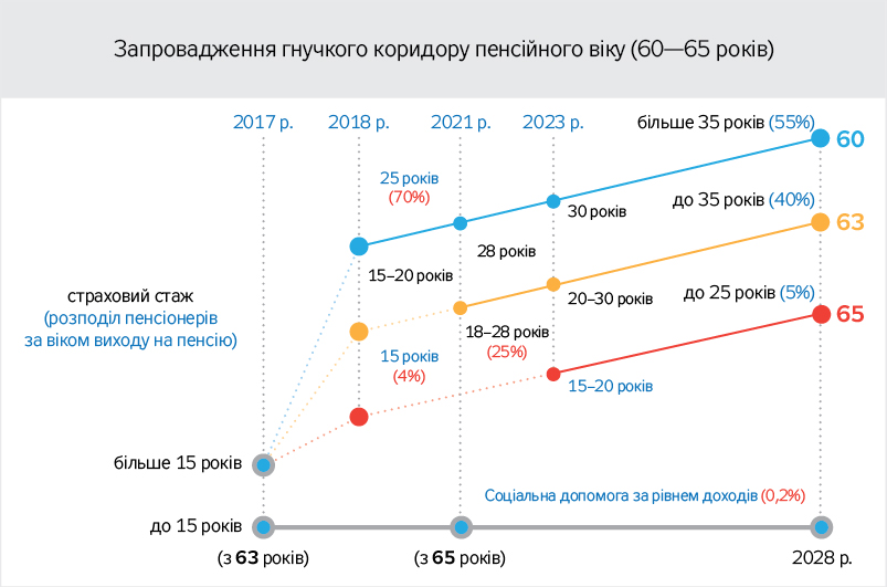 Пенсія за віком у 60 років призначатиметься за наявності страхового стажу 25 років. Кожні 12 місяців вимога до розміру страхового стажу збільшуватиметься на рік і до 2028 р., щоб одержати пенсію за віком, необхідно буде мати 35 років страхового стажу. В 63 роки пенсія за віком як для чоловіків, так і для жінок, призначатиметься за наявності страхового стажу тривалістю від 15 до 25 років. Кожні 12 місяців вимога до кількості страхового стажу збільшуватиметься на рік до досягнення у 2028 р. 25–35 років страхового стажу. Починаючи з 1 січня 2019 р. особам, у яких страховий стаж становить 15 років, пенсія за віком призначатиметься в 65 років.