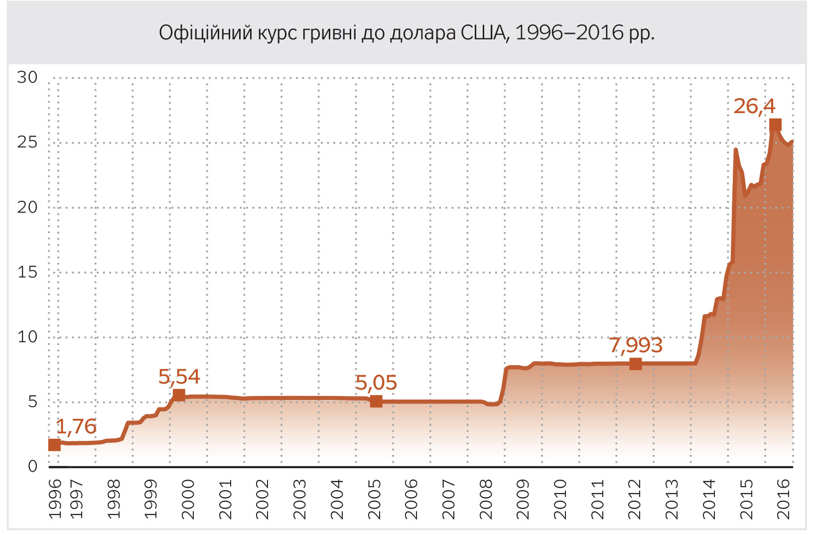 Якщо ж коливання курсу в 10–20% допустимі протягом одного року, то питань ще більше, тому що середньорічне знецінення гривні до долара у 1996–2016 рр. становить… 14–15%. Точно в зазначеному діапазоні. Але хто зважиться назвати нашу курсову історію "прийнятною"?