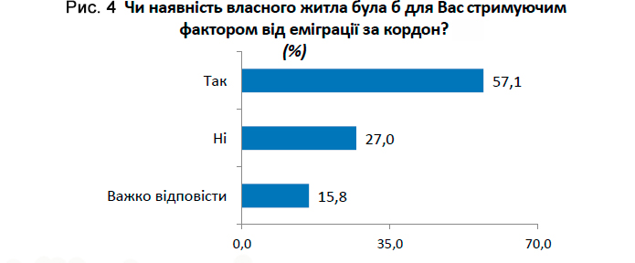 Результат зусиль влади в житловій сфері можна побачити на кордонах нашої країни. Відсутність надії на власне житло є не останнім фактором, який штовхає економічно активних українців до еміграції й прискорює сповзання України в демографічну яму. Давно цікавилися прогнозами стійкості вітчизняної солідарної пенсійної системи? Задумувалися, хто зароблятиме гроші на вашу пенсію? Спробуйте, будете прикро здивовані. А кожен другий наш респондент саме наявність власного житла розглядає як фактор, що стримує від виїзду за кордон. Найбільше тих, для кого житло є «якорем», котрий тримає за рідну землю, живуть на Сході країни (88,9%), найнижчий їх відсоток — у Центрі (44,5%) та на Півдні (29,1%).