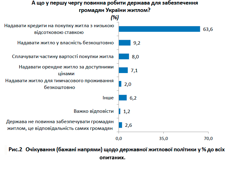Отже, люди невдоволені. І чого ж вони хочуть? А хочуть вони не манни з неба, а речей дуже конкретних і реальних. На думку 63,6% опитаних, для забезпечення житлом держава повинна організувати іпотечне кредитування під низьку відсоткову ставку.