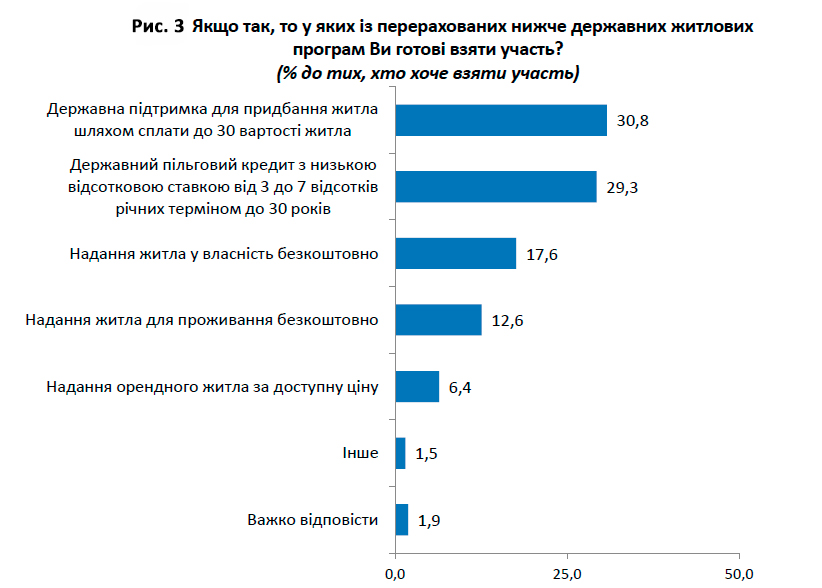 Кожен третій учасник опитування готовий сплачувати пільговий кредит, ще стільки ж, оцінивши свої можливості, згодилися б узяти в держави підтримку в розмірі певної частини вартості житла, а решту сплачувати самотужки… Люди готові навіть на багатолітнє «іпотечне ярмо» — треба тільки запропонувати їм доступні варіанти!