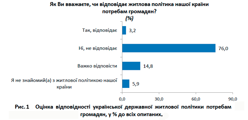 Відразу — ключовий висновок. Переважна більшість тих, хто погодився розповісти про своє ставлення до житлових проблем, украй низько оцінюють якість державної житлової політики: 76% вважають, що вона не відповідає потребам громадян. Тобто саме ті люди, які потерпають без власного даху над головою і не помічають намагань держави зробити хоч щось, аби їх підтримати.
