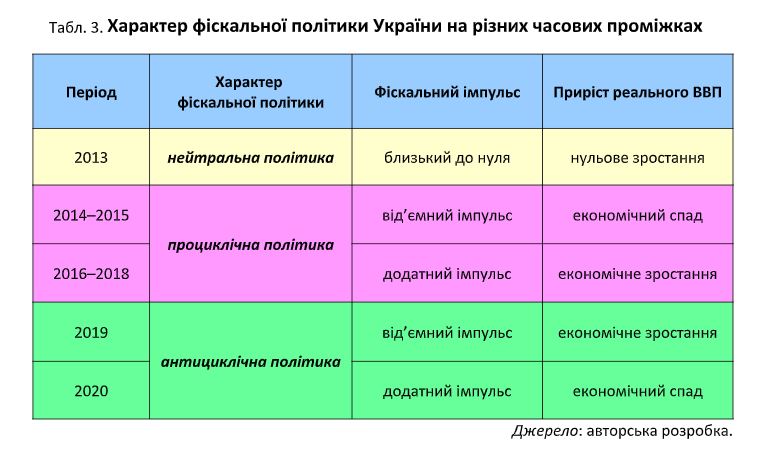 У таблиці 3 надано пояснення щодо проциклічного чи антициклічного характеру фіскальної політики України на основі співставлення показників фіскального імпульсу та показників зростання реального ВВП.