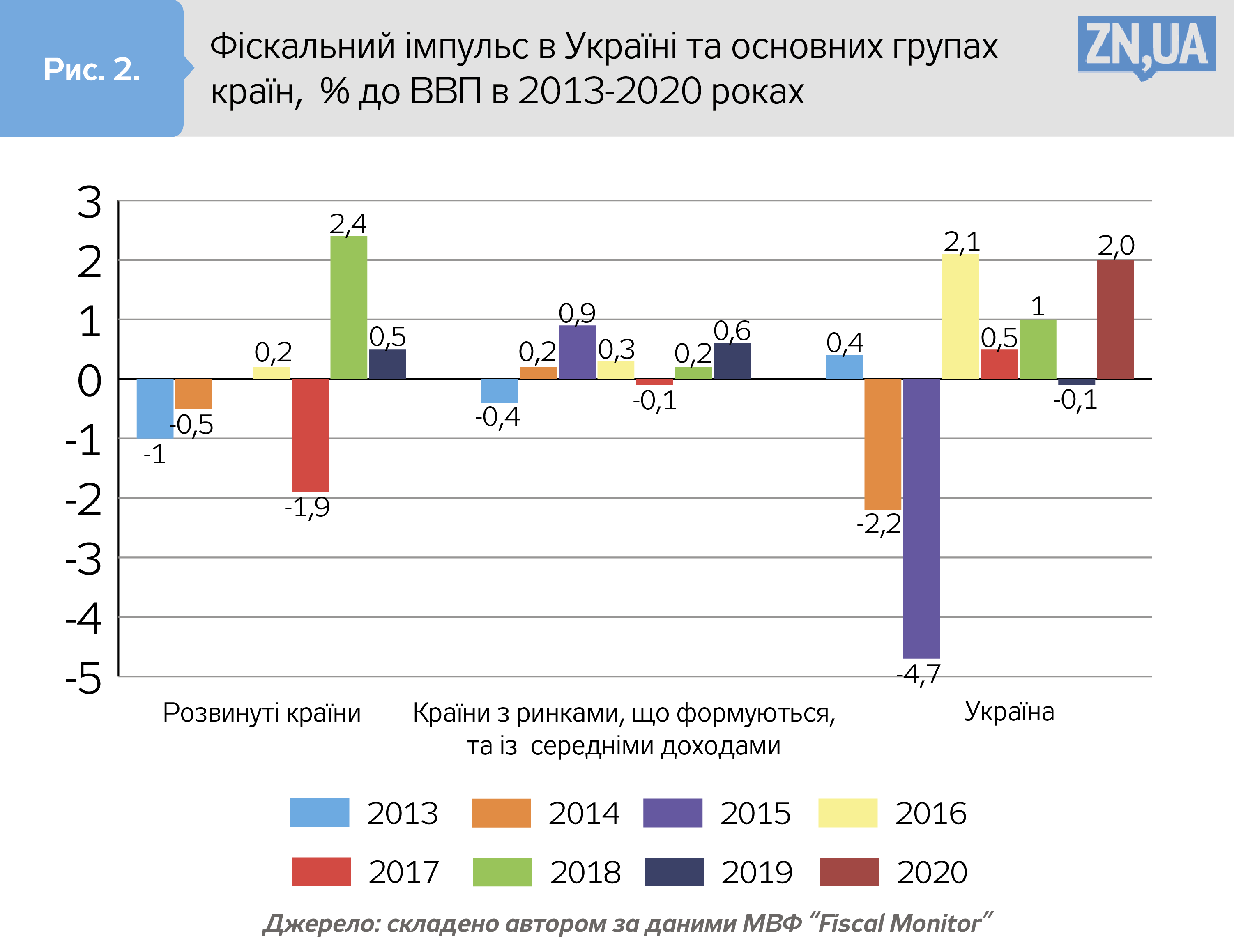 Ще одним корисним показником у практиці фіскального аналізу є показник фіскального імпульсу, який обчислюється як різниця з оберненим знаком циклічно скоригованого первинного балансу поточного і попереднього періодів. Від’ємна величина фіскального імпульсу має місце у період фіскальної консолідації, а додатна — у період фіскальної експансії. На рисунку 2 наведено динаміку показників фіскального імпульсу в Україні та різних групах країн у 2013–2020 роках.