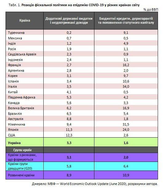 У розвинених країнах вартість заходів фіскальної політики у відповідь на коронакризу МВФ оцінює в сумі 19,8% ВВП 2020 року (див. табл. 1). Причому в структурі фіскальних пакетів додаткові державні видатки і податкові заходи досягають величини 8,9% ВВП, а заходи з підтримки ліквідності — 10,9% ВВП.
