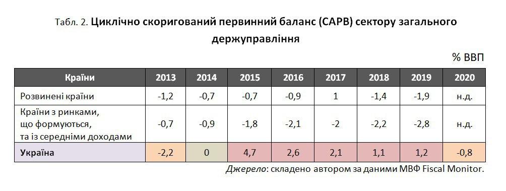 У таблиці 2 наведено дані щодо динаміки CAPB з 2013-го по 2020 рік в Україні та різних групах країн, які підводять до таких висновків: