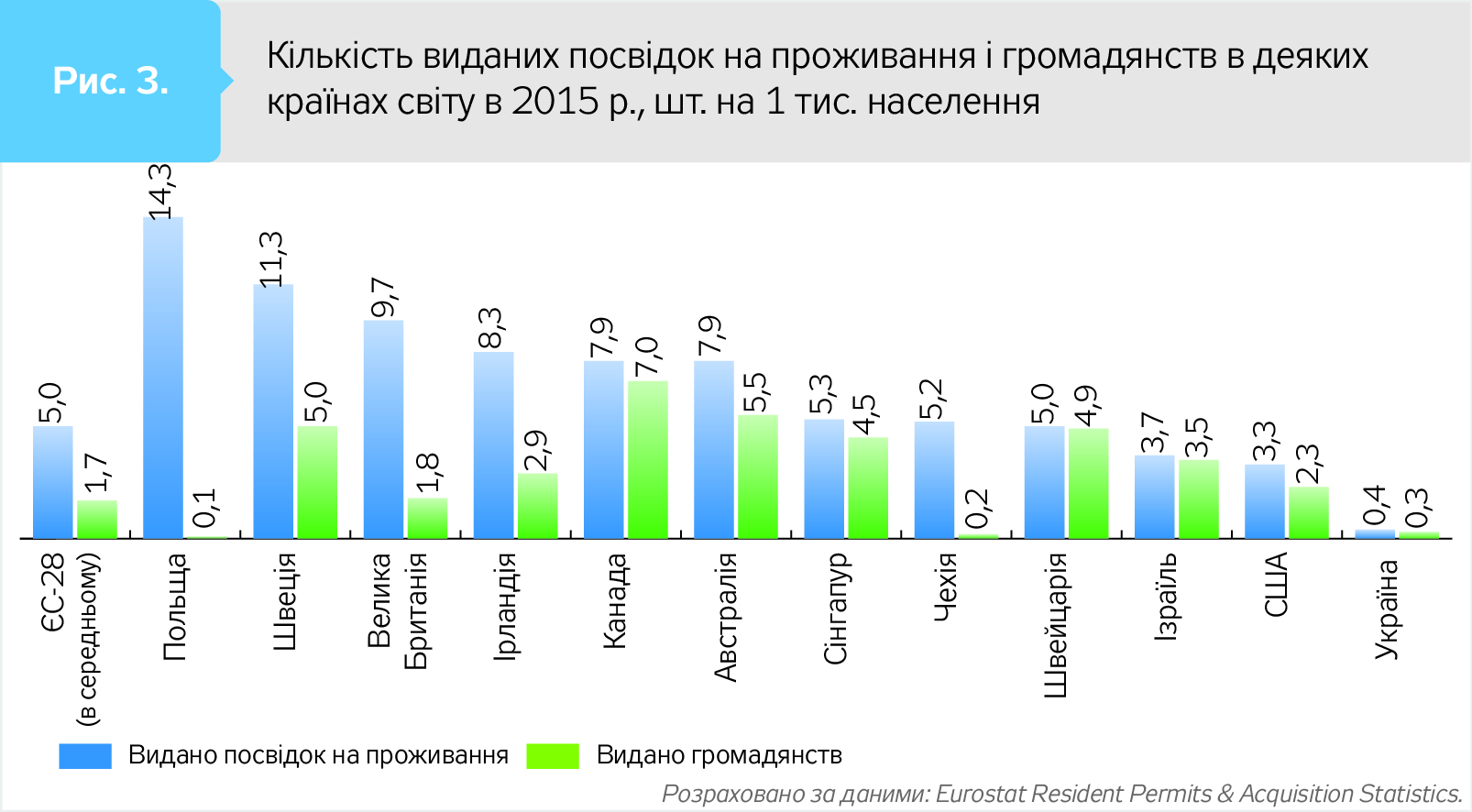 Країнам ЄС щорічно потрібні мільйони нових іммігрантів для підтримки розвитку своїх економік. Тільки Німеччині необхідно понад 500 тис. нових іммігрантів на рік. Тому з метою залучення та, головне, утримання іммігрантів країни ЄС активізували відносно тимчасових мігрантів такі механізми, як видача посвідки на проживання (ПНП) і видача громадянства. Для того, щоб зрозуміти, наскільки країни активні (порівняно з Україною) у залученні іммігрантів, подивимося на рис. 3. У середньому по ЄС на 1000 жителів було видано 5 ПНП (усього понад 2,6 млн шт.) і 1,7 громадянства (841 тис. шт.). А якщо країни хочуть, щоб їхні економіки зростали швидше за США та Канаду (або хоча б не відставали), потрібно залучати ще більше людських ресурсів. Саме це й роблять у тому числі Швеція, Ірландія, Велика Британія. І це відбувається багато в чому за рахунок східноєвропейських країн.