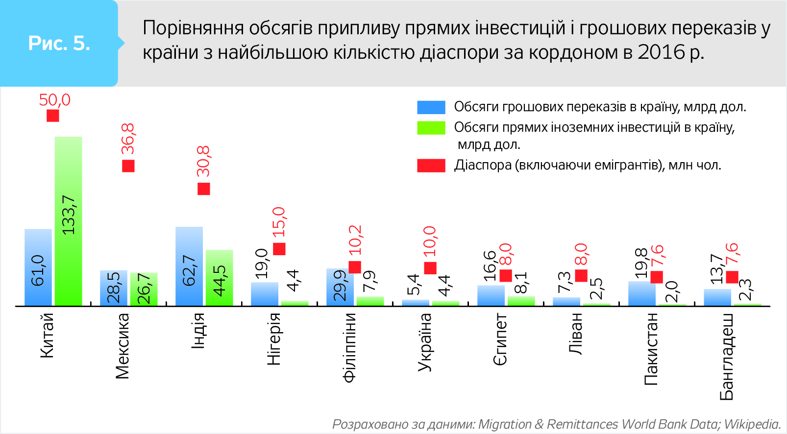 Україна, на відміну від більшості країн світу, має значну кількість своїх емігрантів і діаспору. Україна входить у топ-10 країн світу за масштабами діаспори (рис. 5). Українське співтовариство проживає та працює у великій кількості розвинених країнах і щороку заробляє чималі кошти. Але за обсягами грошових переказів Україна не потрапляє навіть у топ-20 країн світу. Інші країни зі схожою кількістю діаспори одержують від неї в 3–5 разів більше грошових переказів.