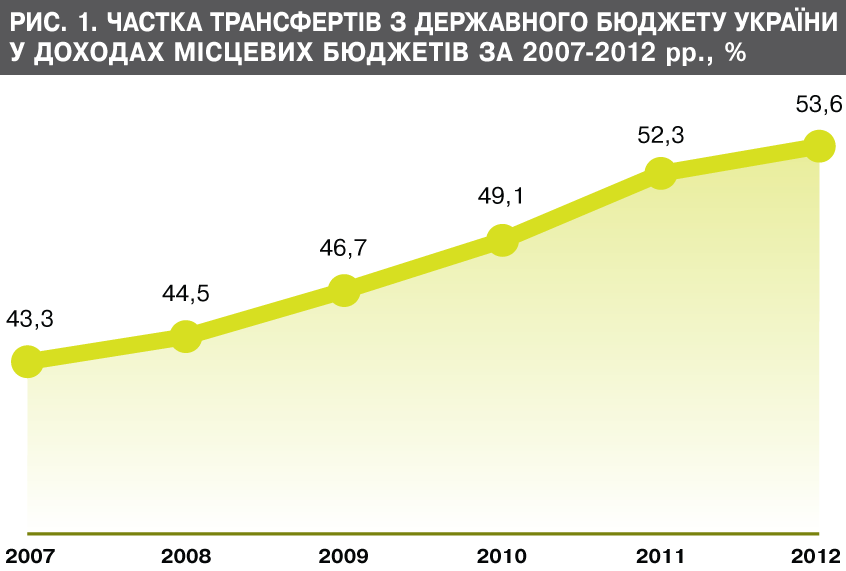 Сьогодні Україна має вищий порівняно з країнами ЄС показник залежності місцевих бюджетів від трансфертів з Державного бюджету (рис. 1), який щороку зростає. В 2007 р. частка таких трансфертів у доходах місцевих бюджетів становила 43,3%, у 2012-му - майже 54 і на 2013-й очікується в обсязі 55–56%. У більшості країн ЄС ця частка є набагато нижчою (наприклад, у Німеччині - 22%, а у Швеції - 34), що означає значно вищий рівень фінансової автономії місцевого самоврядування в Європі. Водночас у Російській Федерації частка міжбюджетних трансфертів у загальному обсязі доходів місцевих бюджетів за 2012 р. становила 61,8%.