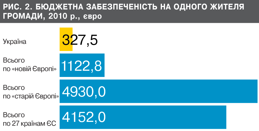 Бюджетна забезпеченість територіальних громад у країнах ЄС та Україні також суттєво різниться (рис. 2). Якщо в Україні на одного жителя за рік витрачається з місцевих бюджетів у середньому 3471,5 грн (найвищий показник у Києві - 4095,7 грн, найнижчий у Луганській області - 2890,5 грн), то в країнах так званої нової Європи цей показник становить 11901,68 грн, а старої Європи ще вищий - 52258,0 грн. Таким чином, у країнах ЄС з муніципального бюджету на одного жителя витрачається коштів у 13 разів більше, ніж із бюджетів українських міст, селищ, сіл. Навіть у країнах "нової Європи" цей показник майже вчетверо вищий за український. Для об'єктивності слід зауважити, що в Російській Федерації цей показник за 2010 р. перевищує український і дорівнює 453,6 євро, або 4808,6 грн на одного жителя громади, а з урахуванням ресурсів бюджетів суб'єктів федерації - 1151,5 євро, або 12205,9 грн.