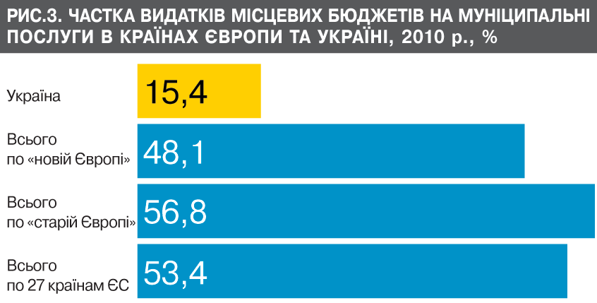 Звичайно, про європейську якість муніципальних послуг в умовах, коли лише 8,7% коштів місцевих бюджетів спрямовується на ці цілі, йтися не може. Саме спрямування в країнах ЄС понад половини коштів місцевих бюджетів на власне муніципальні послуги та самоврядне управління цими процесами і створює таку високу, поки що недосяжну для українців якість життя в кожному європейському місті, містечку чи селі.