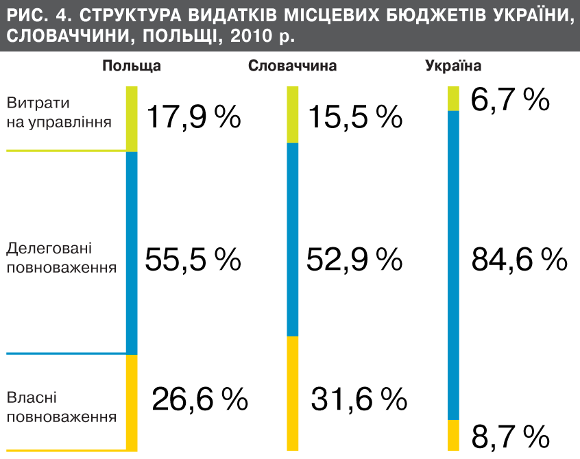 При цьому частка видатків українських місцевих бюджетів, що спрямовується на виконання органами місцевого самоврядування власних повноважень (житлово-комунальне господарство, благоустрій, транспортна сфера, утримання бюджетної та дорожньої інфраструктури, місцеві програми соціально-економічного розвитку тощо), залишається більш як утричі меншою, ніж у країнах ЄС (рис. 3, 4). Необхідно звернути увагу на те, що в Російській Федерації цей показник наближається до загальноєвропейського і в 2010 р. становив 40,1% (зокрема на ЖКГ - 18,3%, на управління - 8,9).