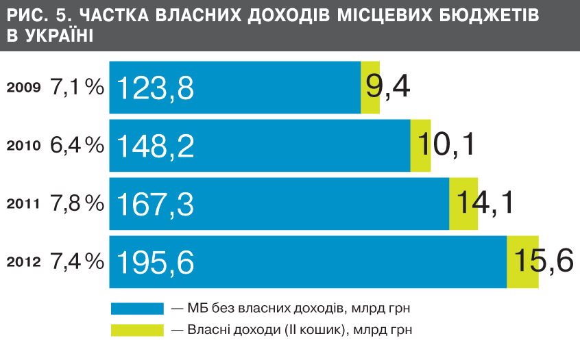 Мізерною залишається в Україні частка власних ресурсів у загальних доходах місцевих бюджетів, яка протягом 2009–2012 рр. не перевищує 8% (рис. 5). Саме власні ресурси спрямовуються на забезпечення належної якості життя в населеному пункті - на благоустрій, житлово-комунальну сферу, забезпечення водою тощо. Для порівняння: в країнах ЄС цей показник становить від 30 до 70% (Великобританія - 37%, Німеччина - 46, Франція - 67%). От чому рівень та якість життя в місті, містечку чи селищі Європи та України кардинально різняться.