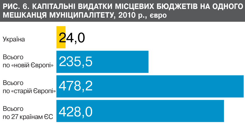 Показником перспектив місцевого розвитку в будь-якій країні є обсяги капітальних видатків місцевих бюджетів. В Україні місцеві бюджети продовжують забезпечувати передусім лише виплату заробітної плати працівникам бюджетних установ, оплату енергоносіїв, пільг і субсидій населенню, тобто виконують переважно функції "соціального гаманця". В Європі органи місцевого самоврядування активно вкладають кошти в інфраструктуру та місцевий економічний розвиток. Обсяг капітальних видатків на одного члена європейської та української територіальної громади відрізняється у 18 разів!