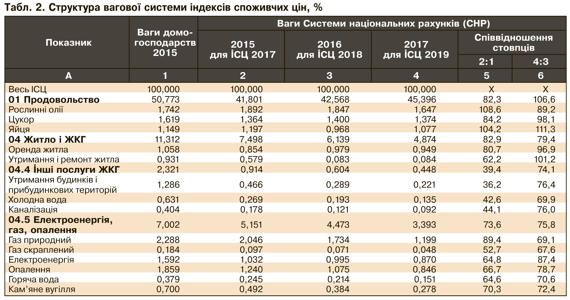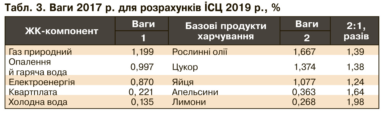 В Україні вже третій рік (з 2017 р.) ІСЦ став розраховуватися за ваговою структурою Системи національних рахунків (СНР), а до цього з 1991 р. він визначався за вагами споживчих витрат, які базувалися на вибіркових обстеженнях домогосподарств. Відмінності у ваговій структурі ІСЦ щодо них виявилися досить істотними, насамперед по ключових позиціях набору. І не менш значущими виявляються зміни в ній уже за новою системою, особливо відносно ваг 2017 р., використовуваних у розрахунках ІСЦ цього року (див. табл. 2).