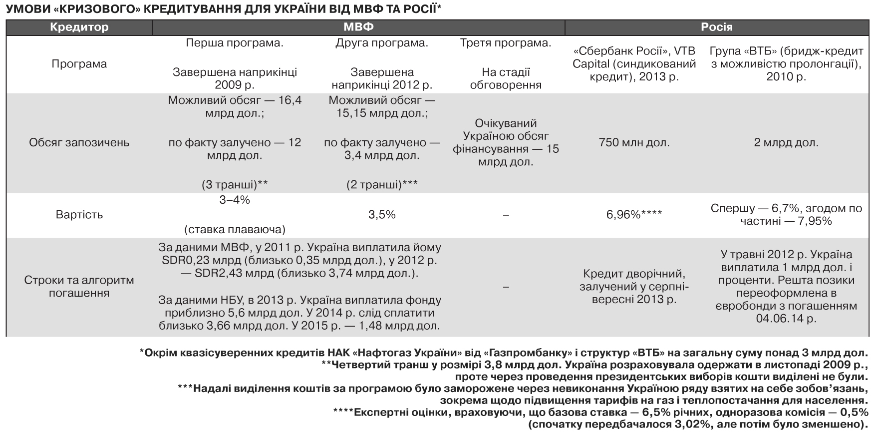 Який з варіантів більш корисний для України? Питання дискусійне, але факт, що кредити МВФ дешевші. Принаймні, якщо виходити з недавньої історії співпраці: від фонду Україна отримувала кредити під 3,5% річних, від російських фінустанов - вдвічі дорожче (див. табл.).