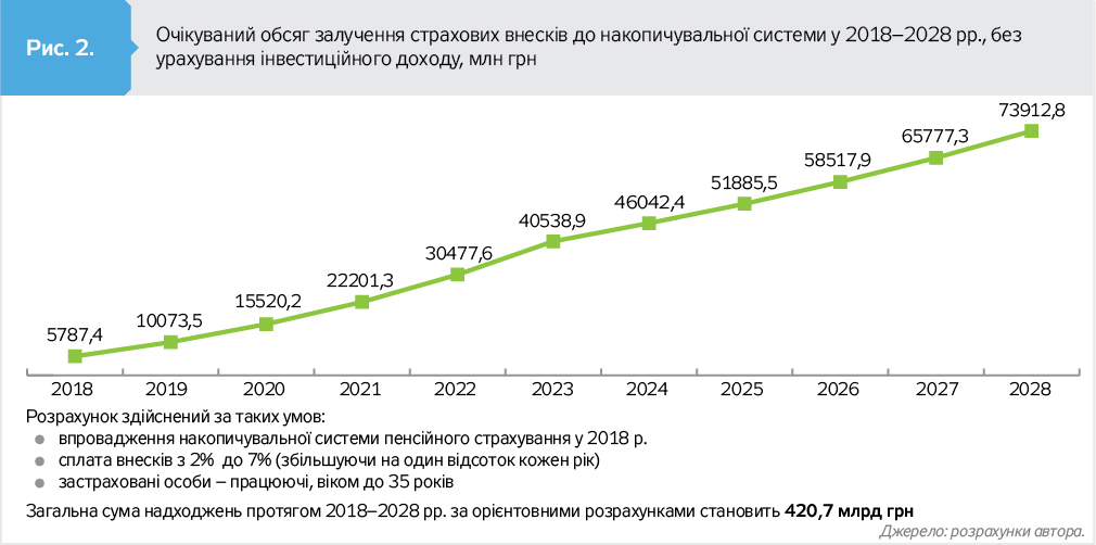 Через відсутність накопичувальної пенсійної системи лише за останні десять років економіка держави недоотримала майже 7 млрд дол. США, що більше за всі позики МВФ за аналогічний період. Натомість впровадження цієї системи дасть можливість у наступні десять років заощадити та залучити в економіку країни понад 420 млрд грн (понад 15,5 млрд дол. за нинішнім курсом) (див. рис. 2).