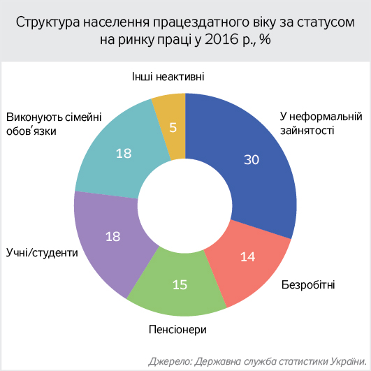 Від політиків і деяких експертів часто доводиться чути, що серед населення працездатного віку близько половини не сплачують внесків, і це резерв для вирішення фінансових проблем страхової системи. Але якщо розглянути структуру населення працездатного віку за статусом на ринку праці, то переважна більшість з цих людей мають досить поважні причини не працювати та/або не сплачувати внесків (див. рис.). Серед незайнятого населення (всього 8,7 млн осіб) 1,7 млн осіб становлять безробітні, майже 2 млн уже є пенсіонерами, ще 4,5 млн осіб - учні/студенти та особи, які виконують сімейні/домашні обов'язки. Серед населення у неформальній зайнятості (всього 3,7 млн осіб) майже