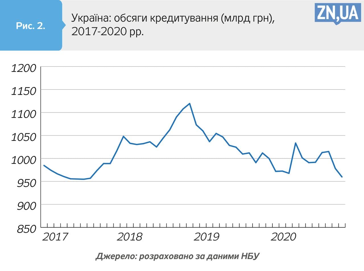 На початку 2018 року, коли загальна вартість кредитів перевищувала 1 трлн грн, окремі члени Ради НБУ бідкалися з приводу недостатніх обсягів кредитування, а що тоді казати про осінь 2020-го (див. рис. 2). Попри «парадигмальні» зміни в монетарній політиці, не відбулося ні демонтажу піраміди ОВДП (цьогоріч справжньої), ні очікуваного збільшення обсягів кредитування. На рівень кредитної активності зразка кінця 2018 року, коли нібито панувала наджорстка монетарна політика, в обсязі 1119 млрд грн повернемося не скоро. В грудні 2020-го обсяги кредитування зменшилися до 948 млрд грн проти 965 млрд у листопаді, хоча ще в липні минулого року все виглядало так, ніби попит на кредити почав відновлюватися. Не сталося. Звичайно, немає підстав вважати, що зміна тренду пов’язана зі змінами в керівництві НБУ. Але тоді треба шукати інші причини.