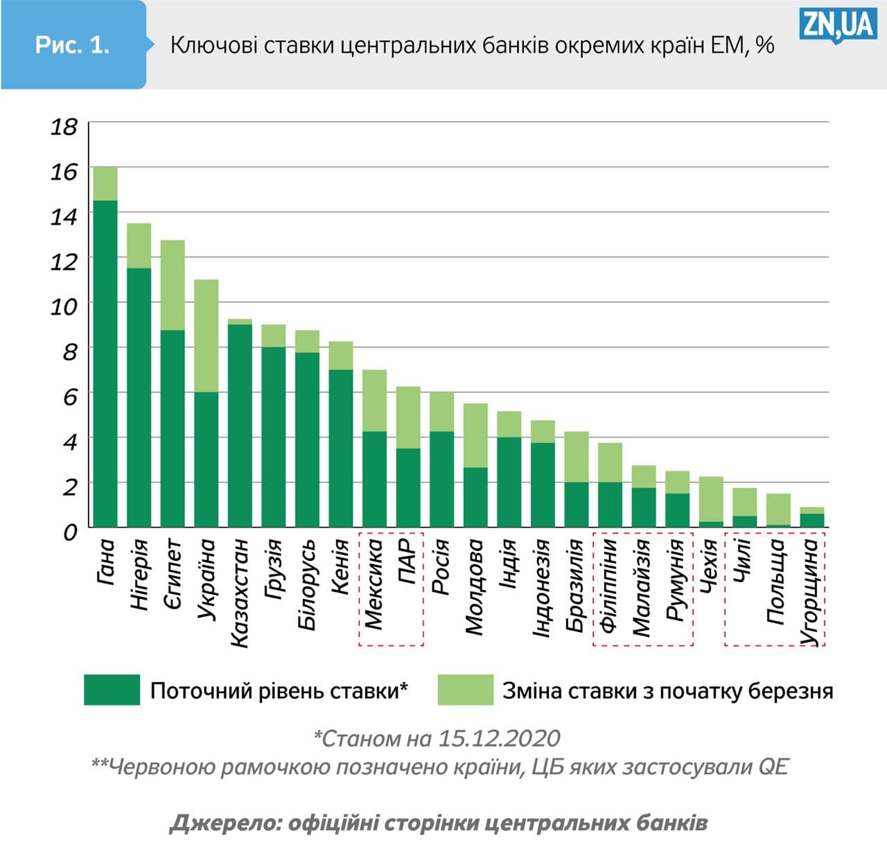 Більшість центральних банків EM мали дещо більший простір для маневру у застосуванні перевірених часом традиційних інструментів. Тому вони активно задіяли ключові ставки, рефінансування банків і валютні інтервенції для забезпечення цінової та фінансової стабільності, підтримання необхідного рівня ліквідності в економіці та безперебійного функціонування платіжних систем, а через це — для стимулювання реального сектору (див. рис. 1).