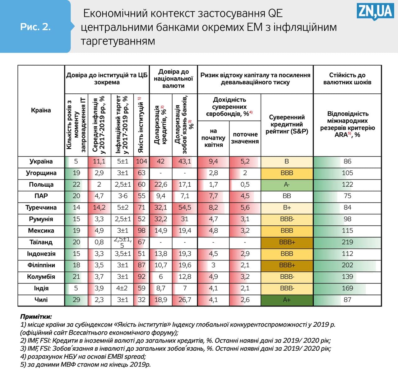 По-друге, простір політики визначається вразливістю економіки. З початком кризи ЕМ зазнали значного негативного шоку, що, зокрема, проявився у відчутному відпливі капіталу та більшій волатильності місцевих валют. Більшість центральних банків ЕМ були змушені перейматися довгостроковими ефектами від застосування неконвенційних монетарних інструментів на цінову та фінансову стабільність. Тому, наприклад, більш впевнено застосувати QE могли дозволити собі країни ЕМ із високим суверенним рейтингом (який забезпечує впевненість у платоспроможності уряду) і більшим запасом міжнародних резервів (що дає можливість протистояти валютним шокам). Хоча складається враження, що були й такі центральні банки, які в умовах підвищеної економічної невизначеності вдалися до застосування неконвенційних монетарних інструментів, потрапивши під вплив «ефекту натовпу», та/або вирішивши «розв’язувати проблеми по мірі їх надходження», та/або з інших міркувань.