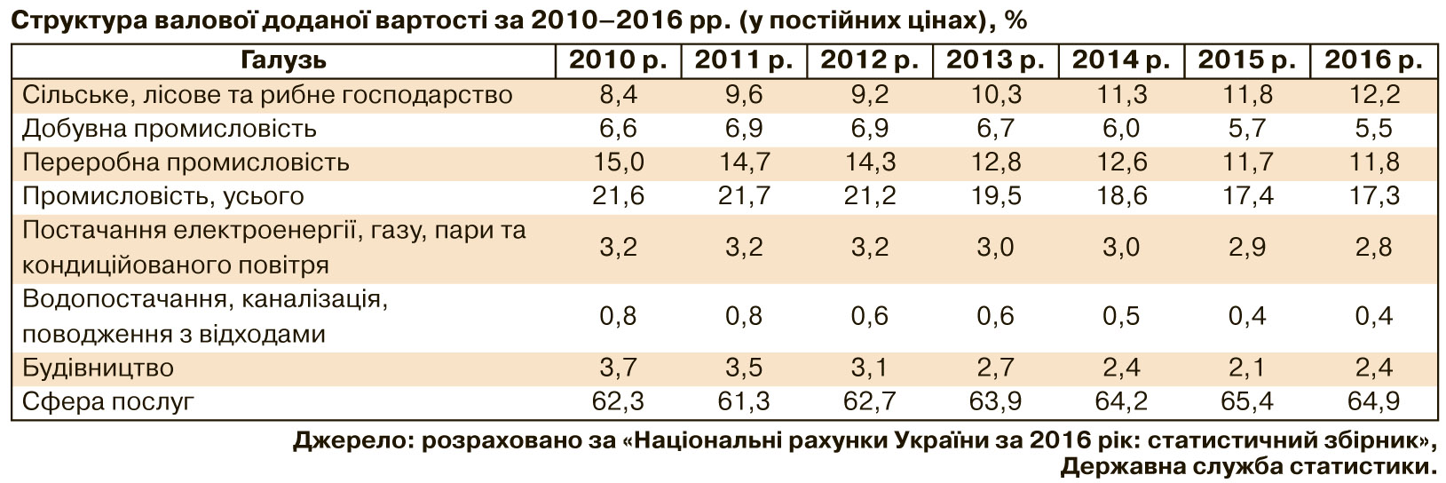 Суттєво знизилася протягом останніх років частка переробної промисловості у структурі валової доданої вартості, натомість частка аграрного сектора виробництва продовжує зростати (див. табл.).