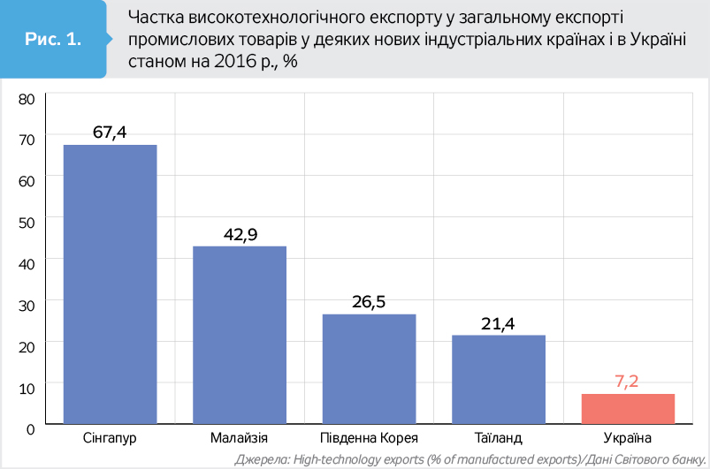 По суті, Україна перетворилася з індустріально розвиненої країни, якою була раніше, на аграрно-індустріальну з низьким рівнем технологічного розвитку та конкурентоспроможності на світовій арені. Основну частку українського експорту становлять продукція сільського господарства та метали - 57,9% станом на кінець 2017 р., у січні 2018-го вона ще збільшилася - до 58,1%. Експорт високотехнологічної української продукції становить 7,2% загального експорту промислових товарів. Обнадійливими виглядають тенденції підвищення цього показника: з 2011 р. - на 2,9%. Разом із тим відставання від нових індустріальних країн усе ще вражаюче - у 3–9 разів (рис. 1).
