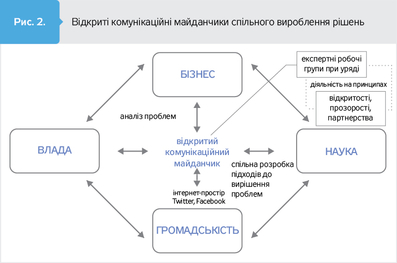 Конкретні кроки в цьому напрямі мають передбачати у тому числі розвиток комунікаційних майданчиків між владою, бізнесом, наукою, освітою та широкою громадськістю для обміну інформацією, колегіального вироблення рішень найгостріших проблем інноваційної сфери (рис. 2).